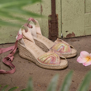 Romero Cuña Media Plataforma Rafia Flores Rosa Claro
