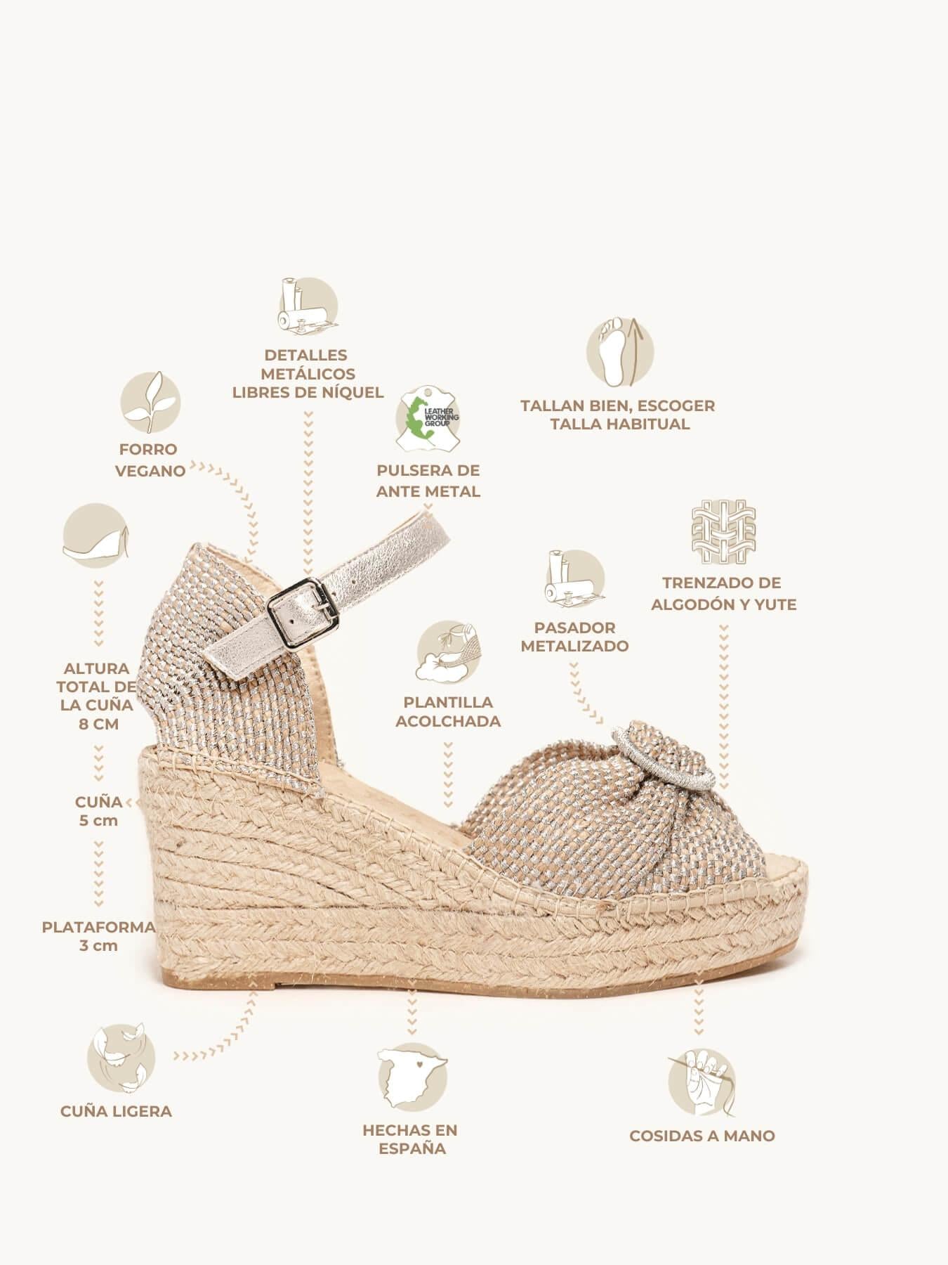 - Cuña de trenza de Yute natural con suela de goma reciclada mezclada con fibras naturales.