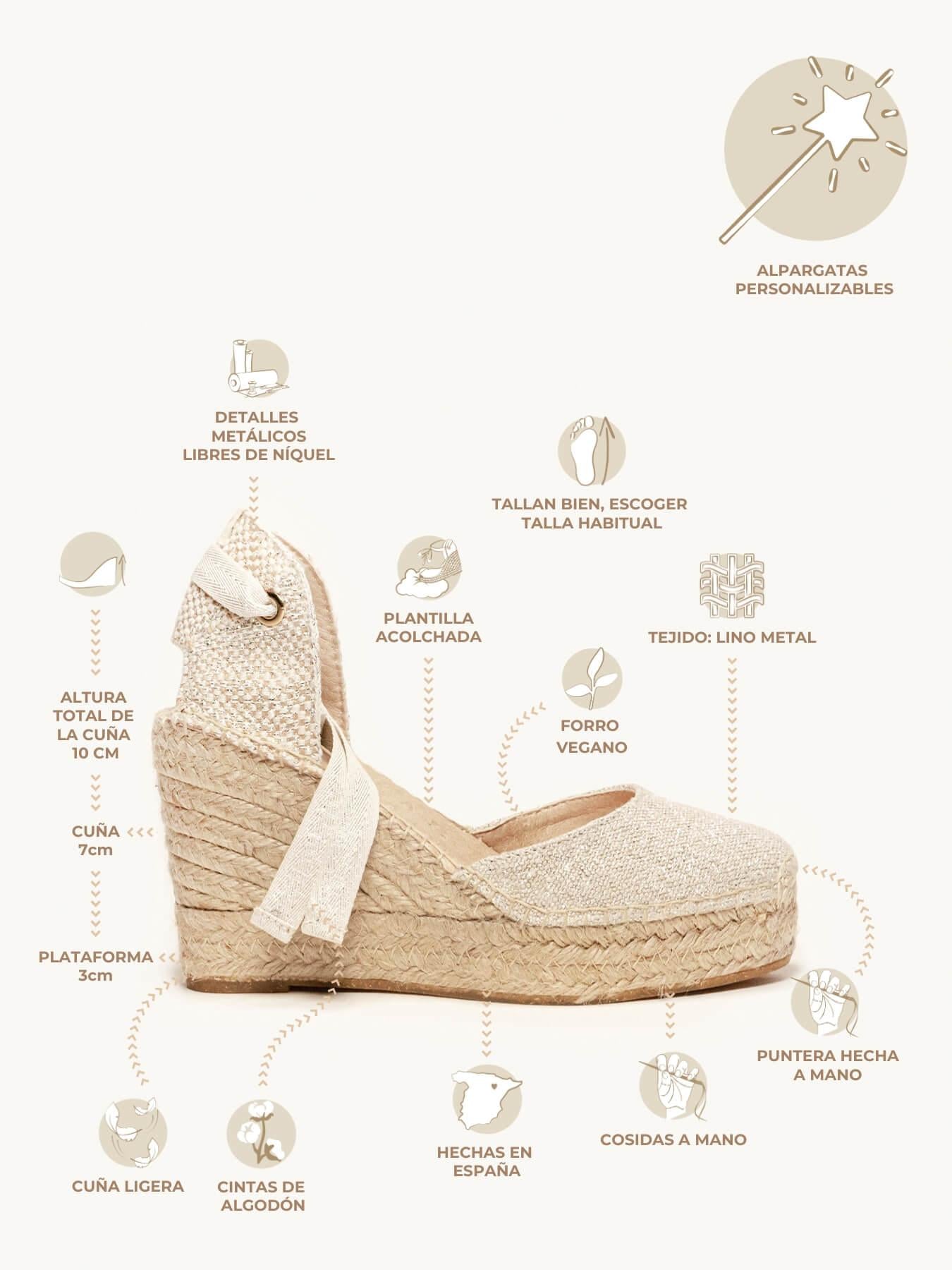 - El Lino Metal de la alpargata Cala es de algodón, lino, algodón reciclado, poliéster reciclado, poliéster y poliamida