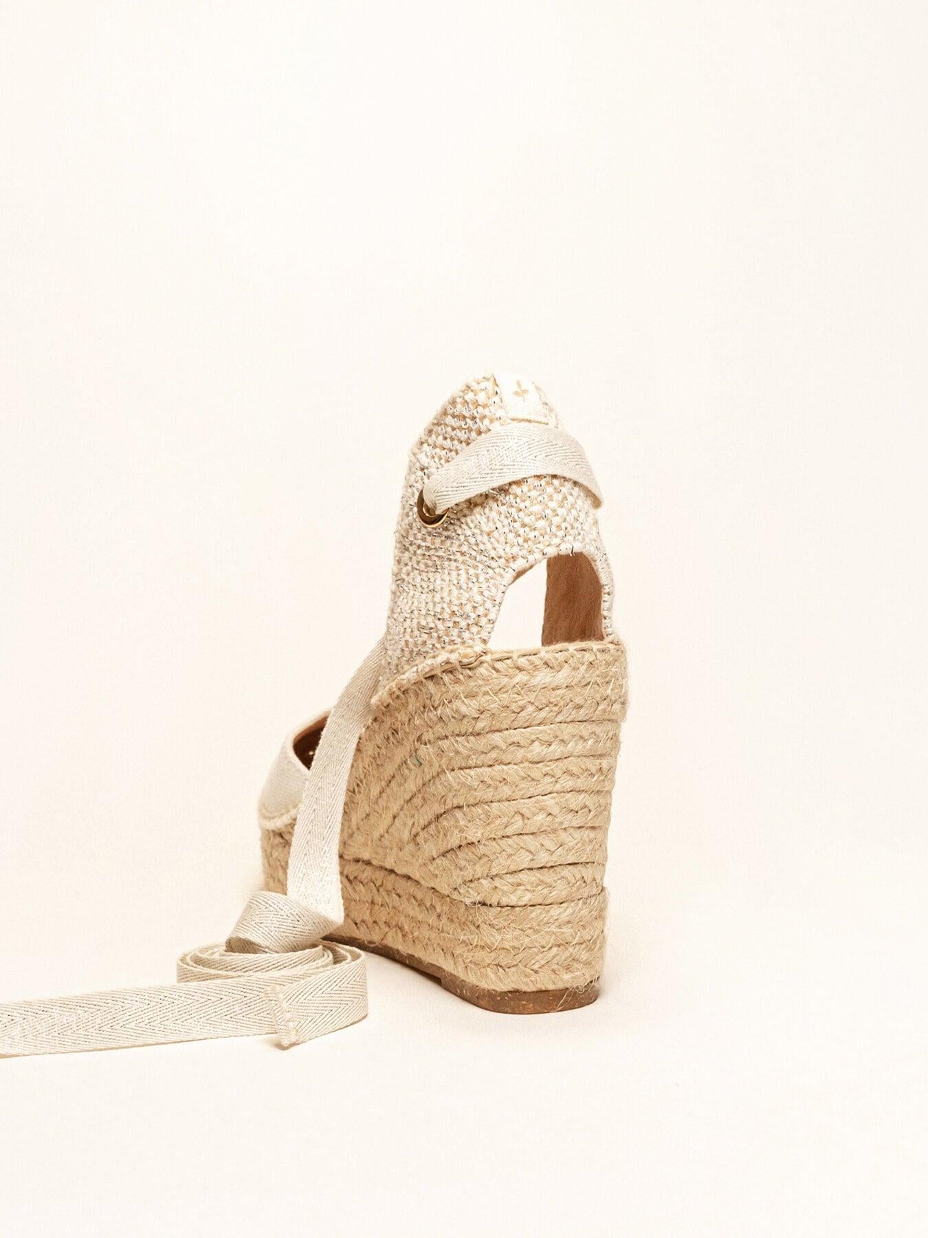 - Cuña de trenza de Yute natural con suela de goma reciclada mezclada con fibras naturales.