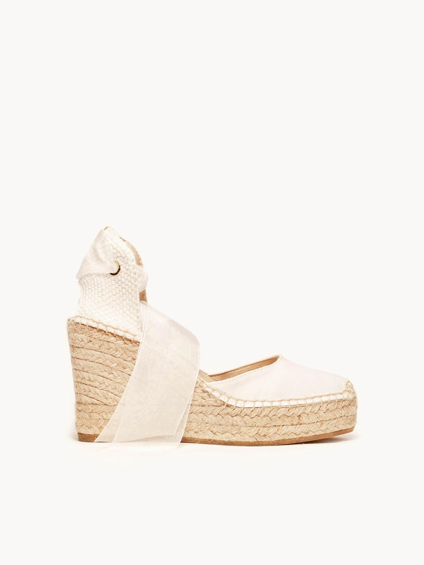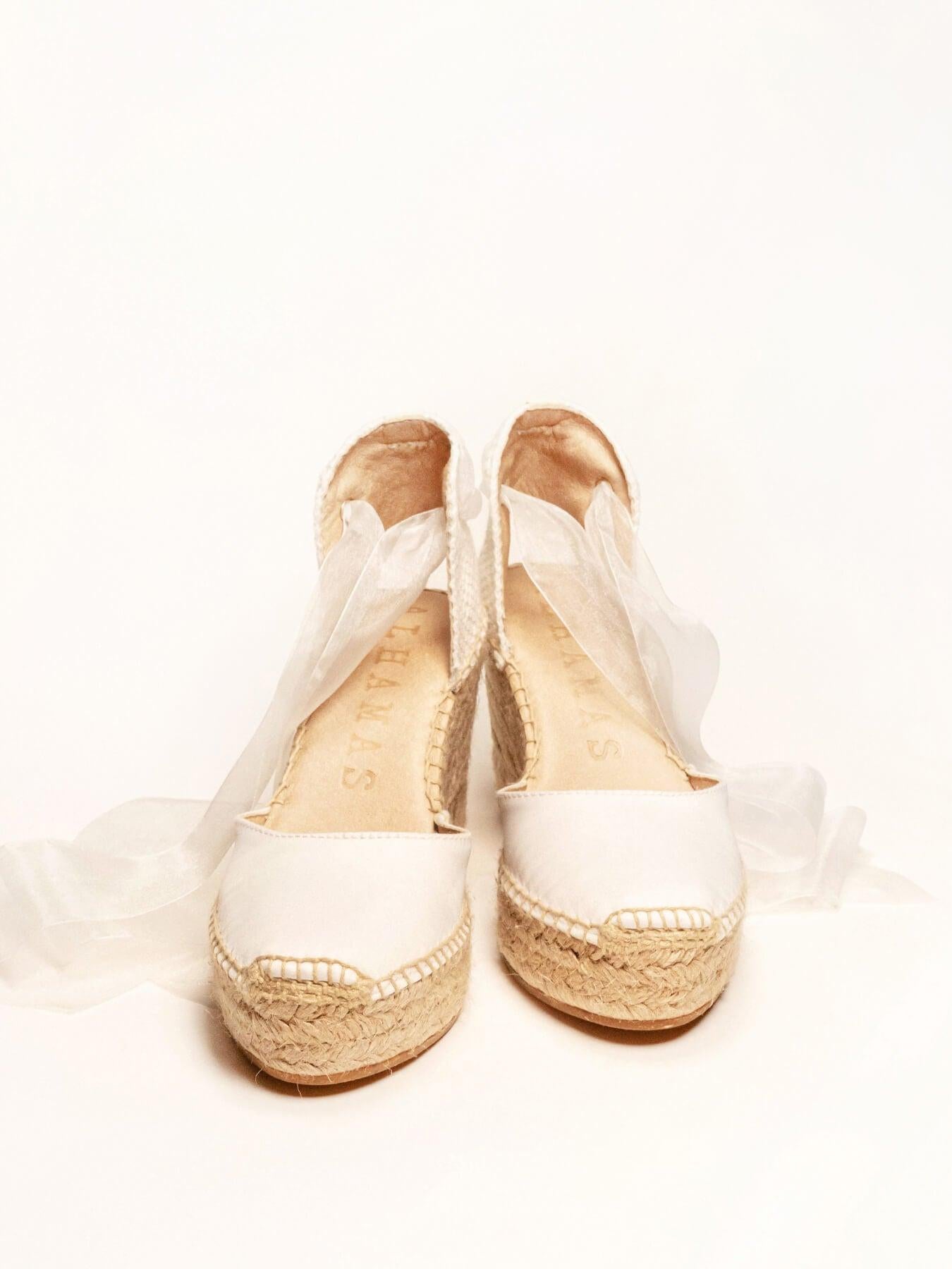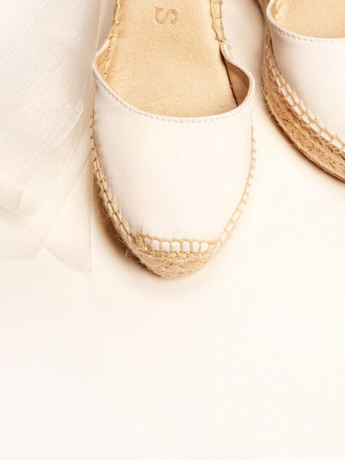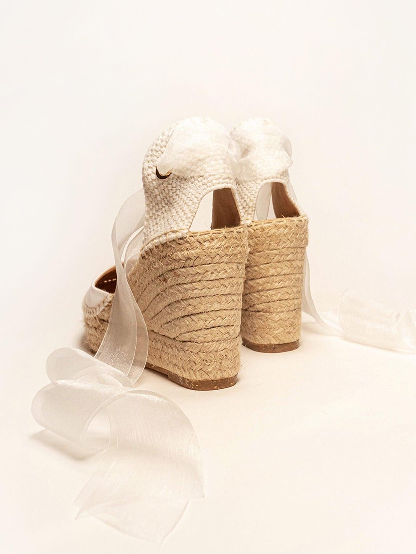 La alpargata de cuña alta Cala, es uno de nuestros modelos más especiales, perfecto para tu día. Las alpargatas de novia que podrás elegir como primera opción o como alpargatas de cambio. Conservarás la altura, sus cintas darán ese toque especial a tu vestido y llevarás las alpargatas cómodas que te permitirán disfrutar al máximo.