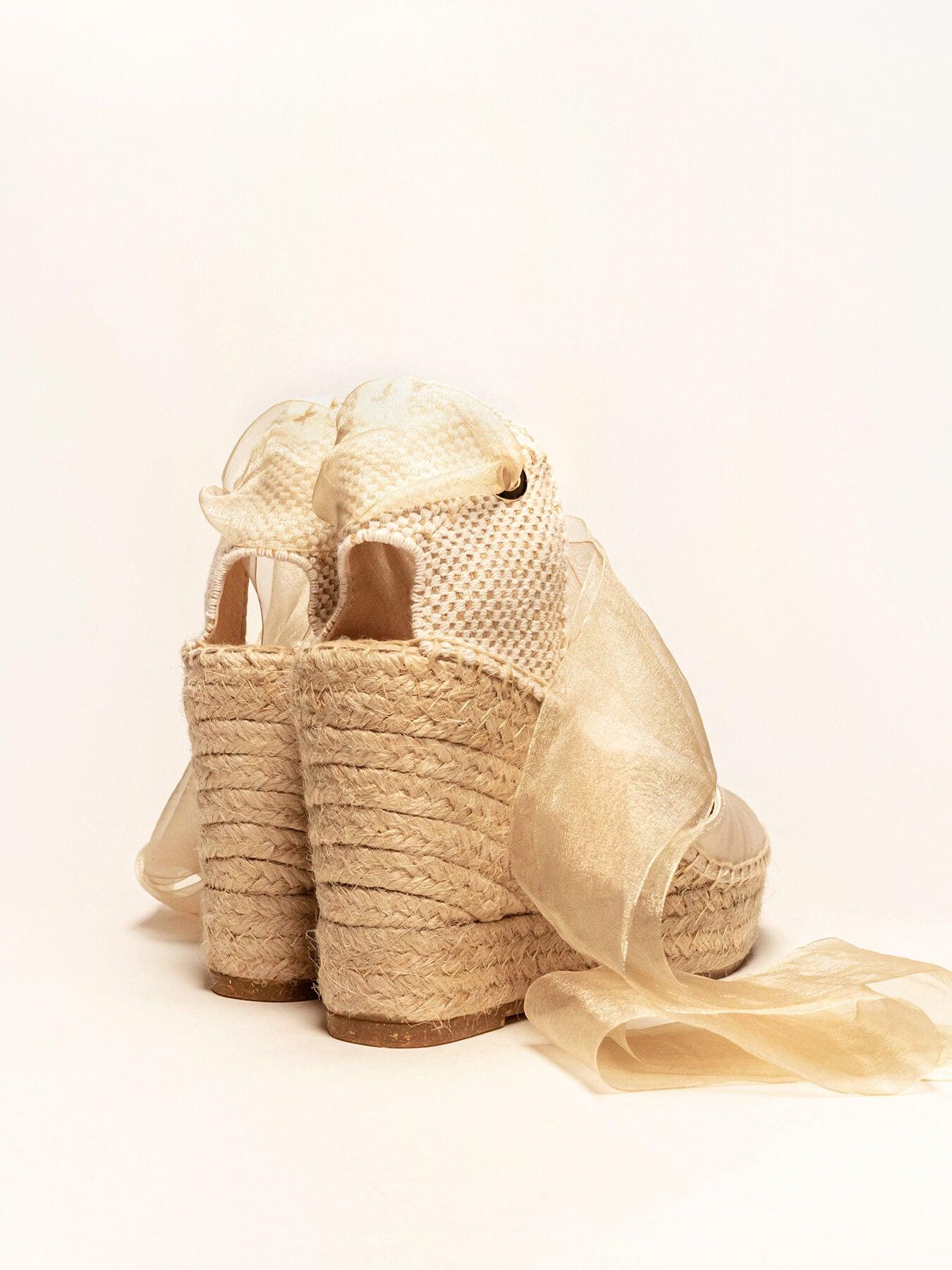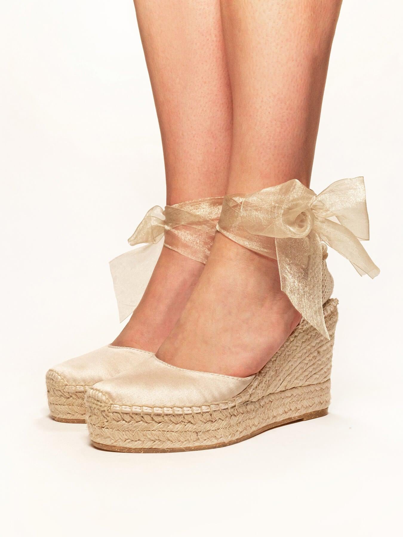La alpargata de cuña alta Cala, es uno de nuestros modelos más especiales, perfecto para tu día. Las alpargatas de novia que podrás elegir como primera opción o como alpargatas de cambio. Conservarás la altura, sus cintas darán ese toque especial a tu vestido y llevarás las alpargatas cómodas que te permitirán disfrutar al máximo.