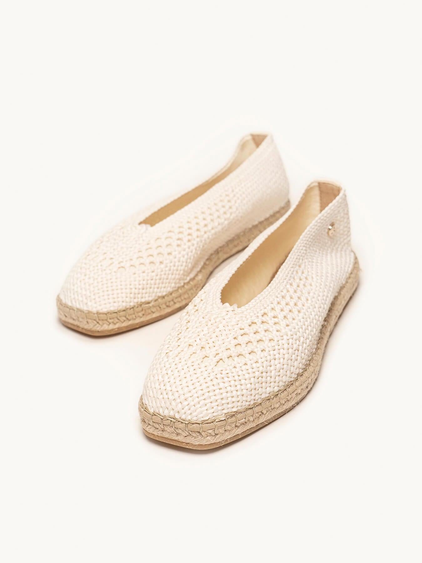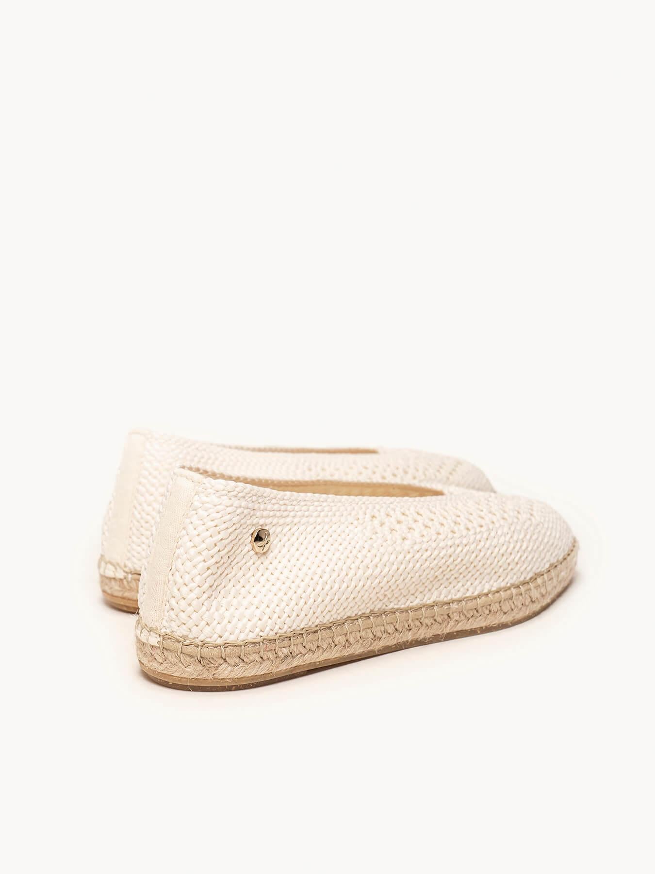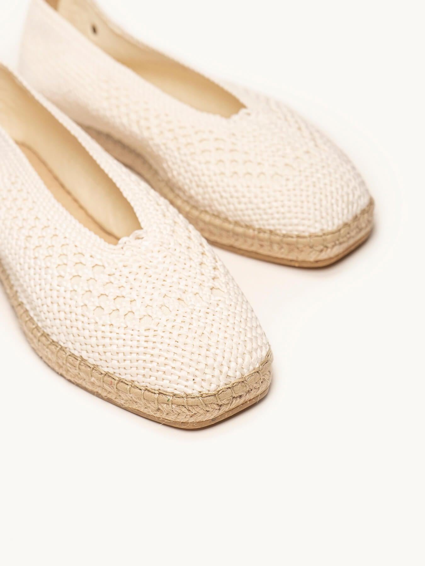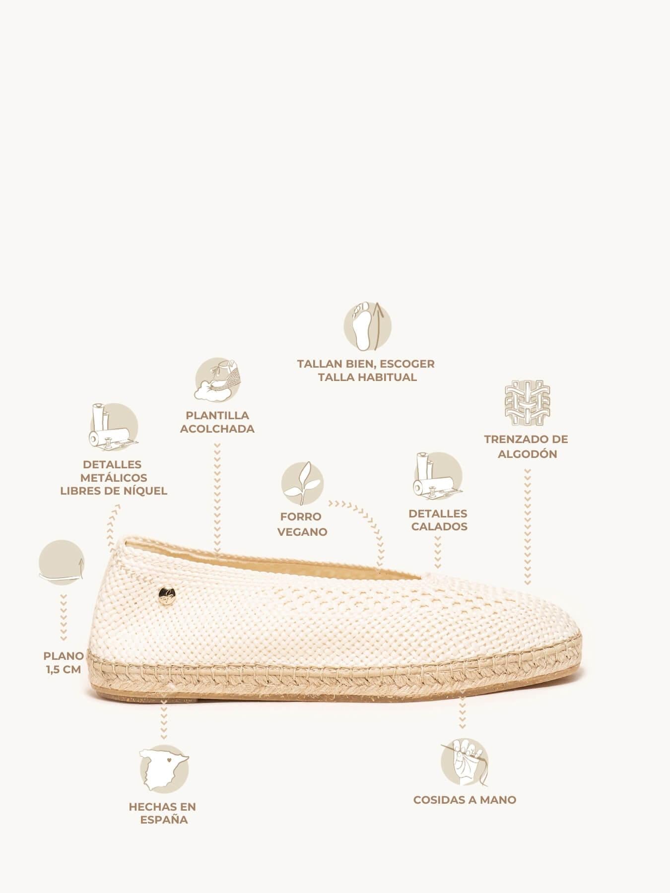 La alpargata plana Caléndula es nuestra bailarina trenzada. Una bailarina es un modelo muy versátil, ideal para el día a día y también para darle un toque muy chic a los looks más especiales. Sujeta muy bien además irás súper cómoda durante todo el día y verás tu pie super estilizado.