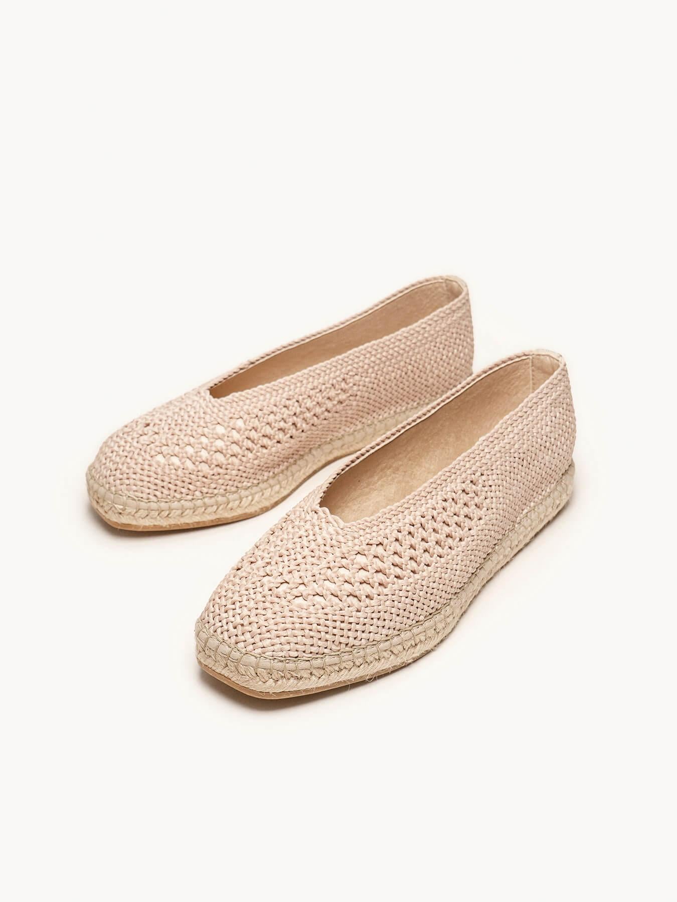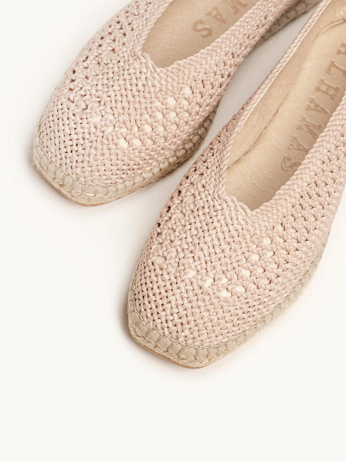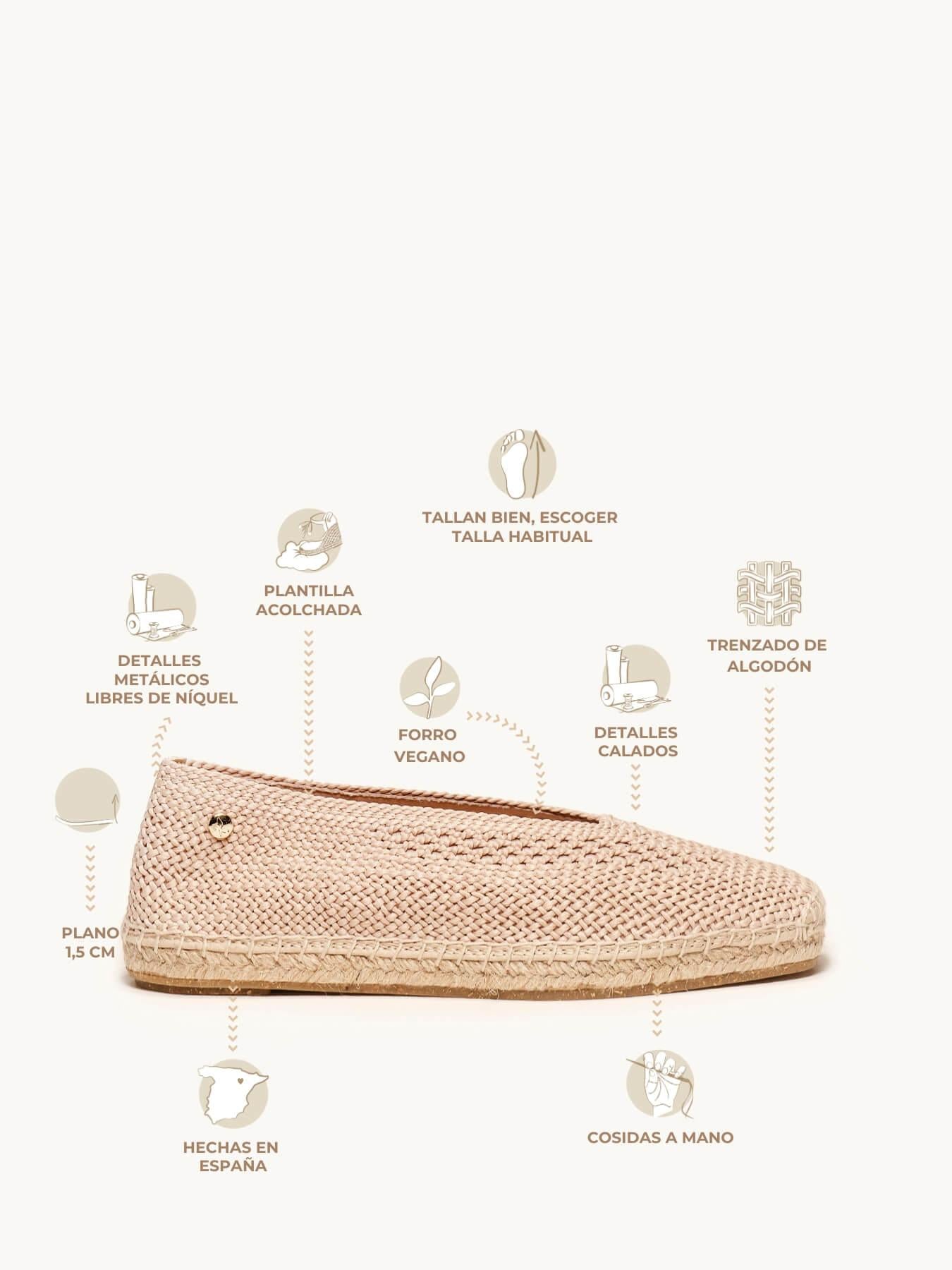 La alpargata plana Caléndula es nuestra bailarina trenzada. Una bailarina es un modelo muy versátil, ideal para el día a día y también para darle un toque muy chic a los looks más especiales. Sujeta muy bien además irás súper cómoda durante todo el día y verás tu pie súper estilizado.