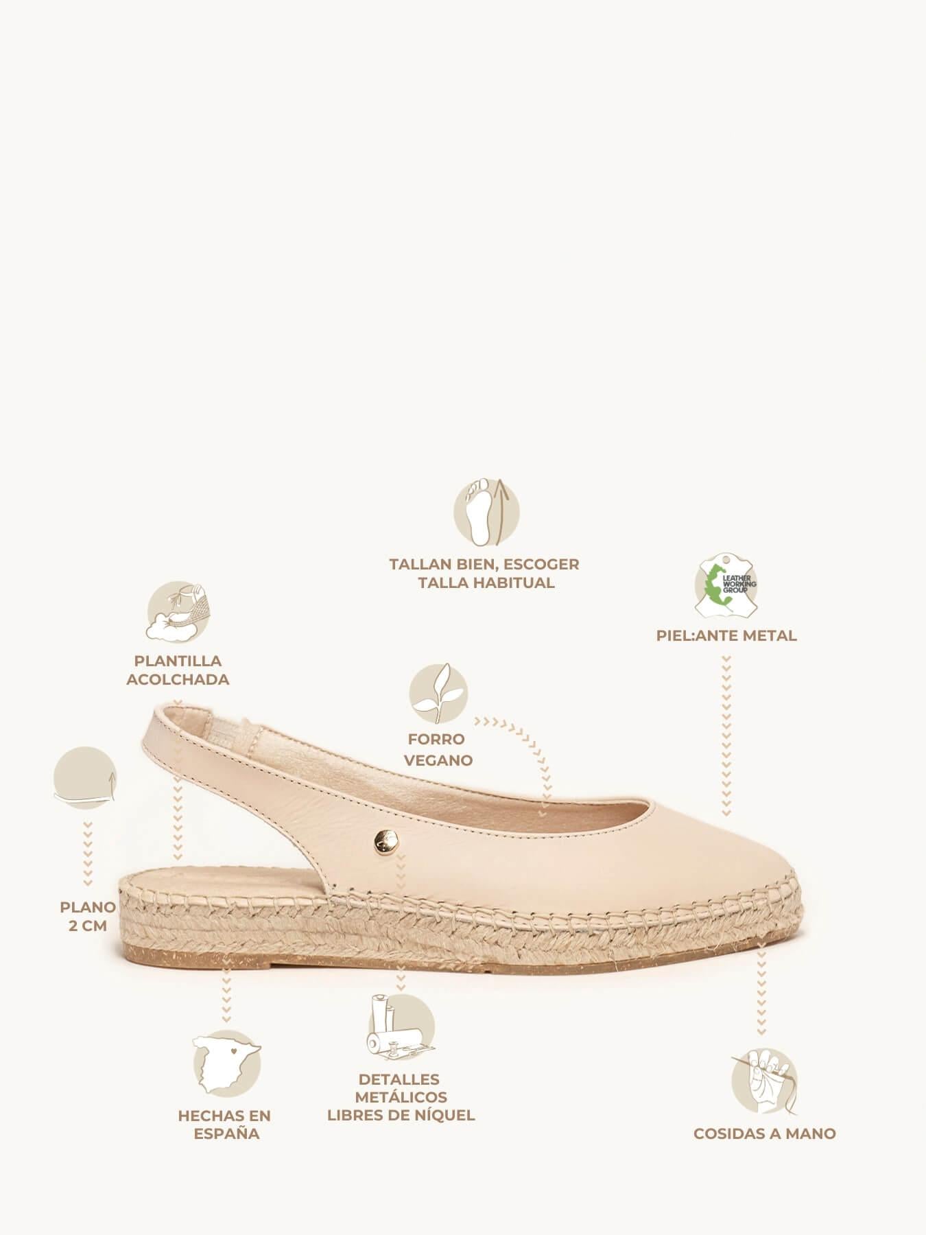 - La Napa de la alpargata Camelia está certificada por el Leather Working Group (una organización que promueve prácticas ambientales sostenibles) El forro y la plantilla son de microfibra transpirable y antibacteriana. Suela de trenza de yute natural con goma reciclada mezclada con fibras naturales. Elementos metálicos libres de níquel. Hilo de cosido a mano de algodón.