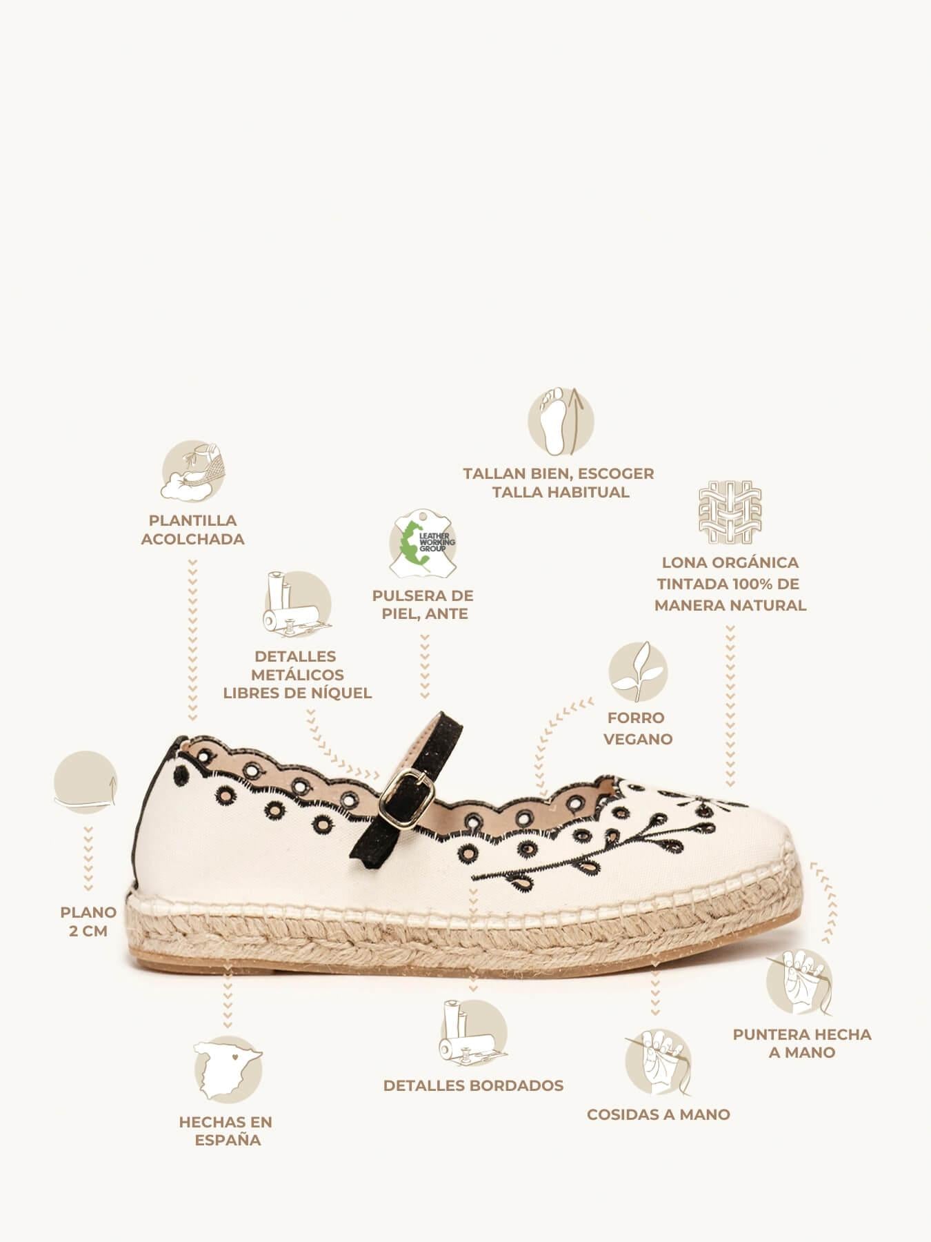 - El tejido de la alpargata Campanilla es de algodón orgánico tintado con tintes 100% naturales y traba de piel.