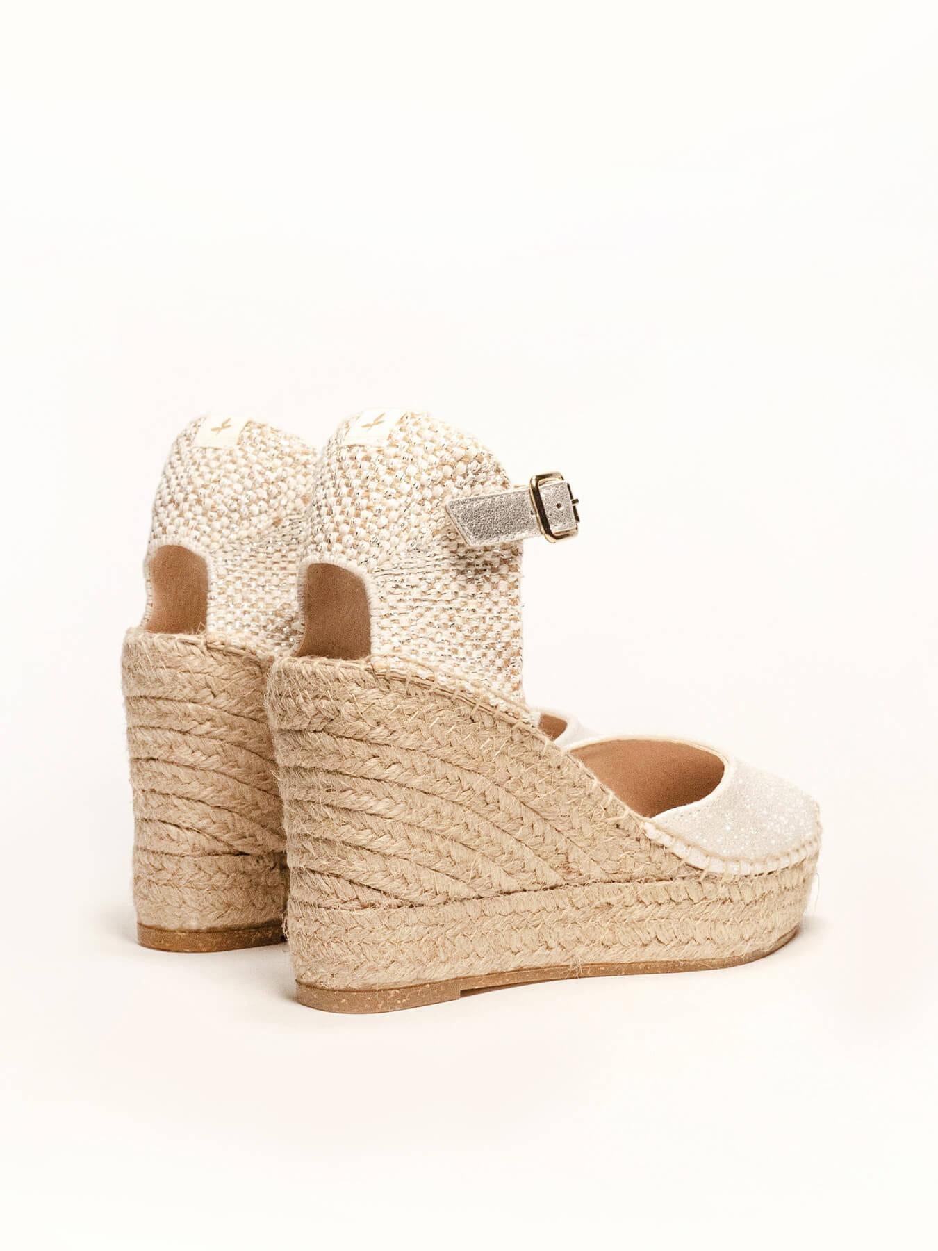 - Cuña de trenza de Yute natural con suela de goma reciclada mezclada con fibras naturales.