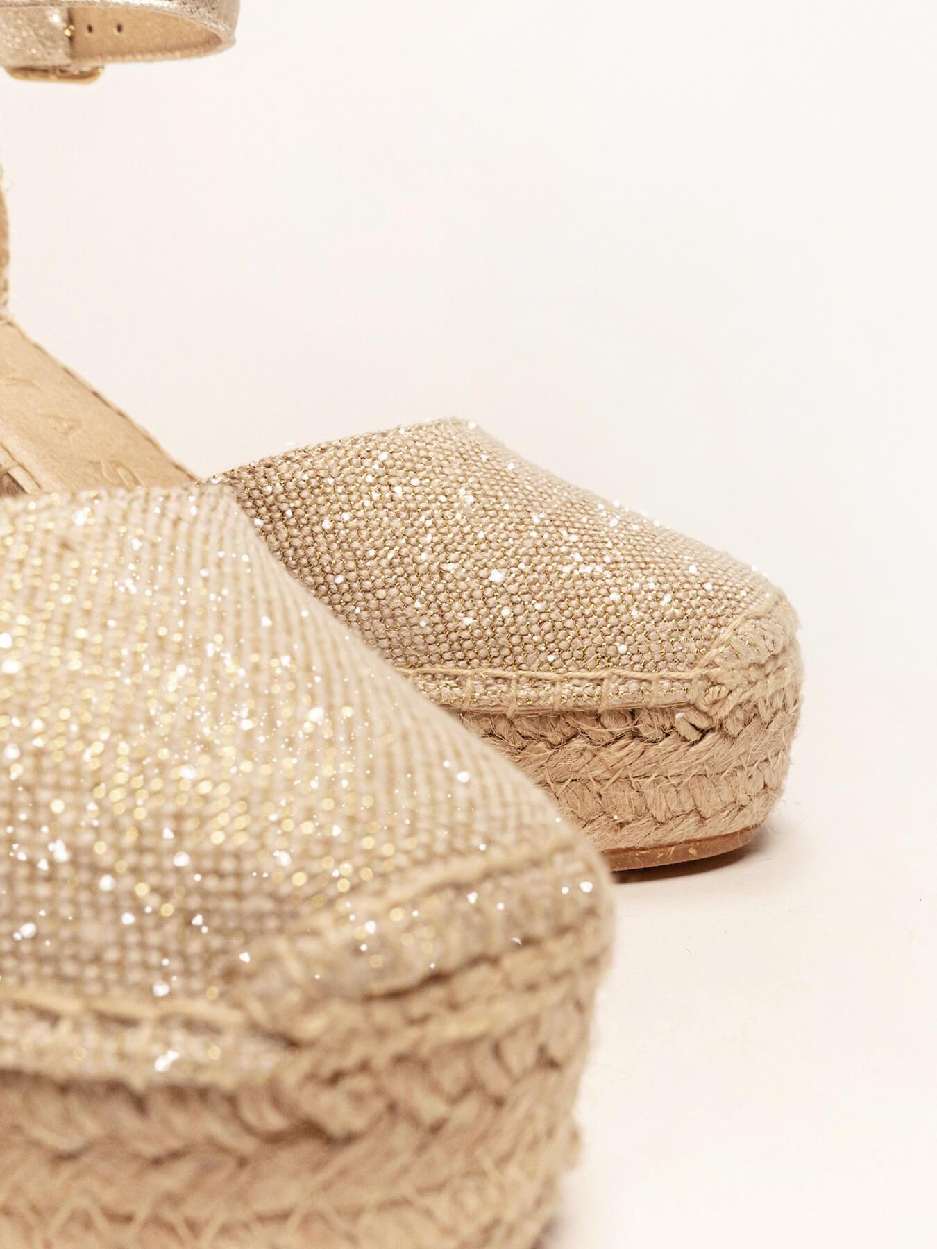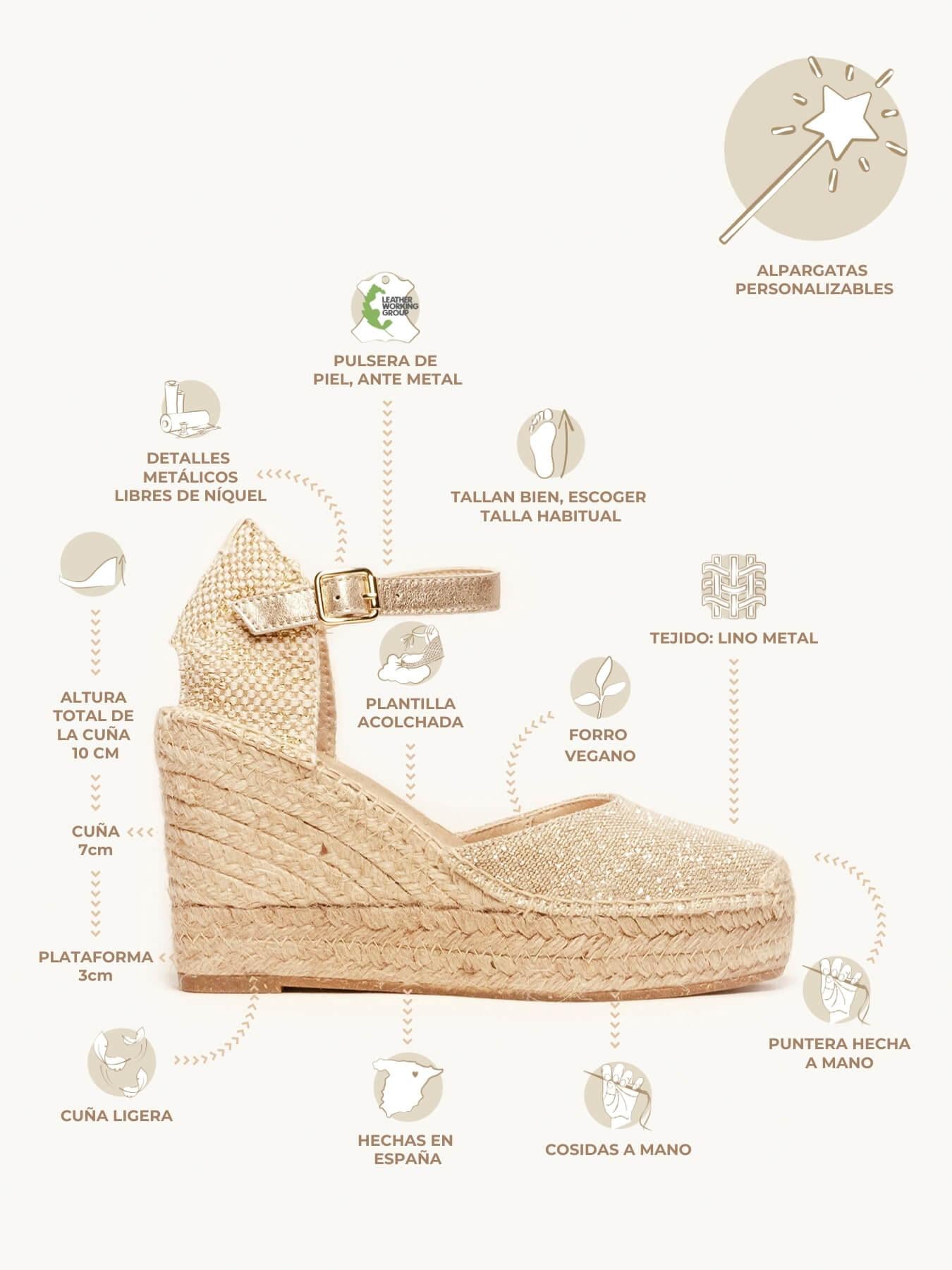 - Cuña de trenza de yute natural con suela de goma reciclada mezclada con fibras naturales.