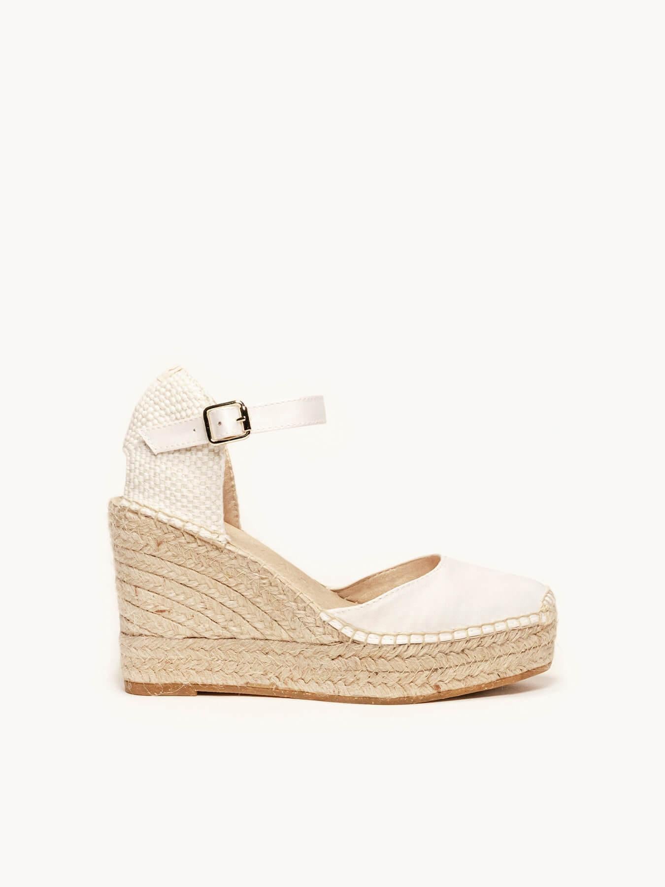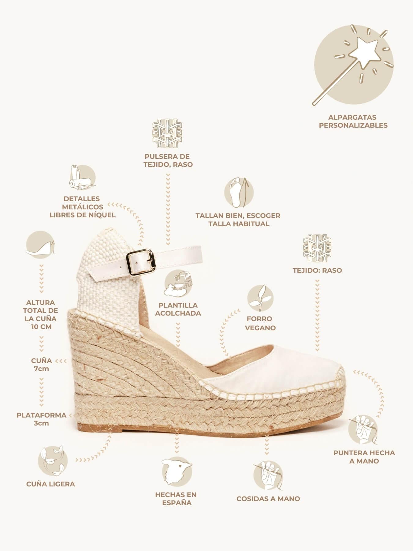 La alpargata de cuña alta Dalia, es uno de nuestros modelos más especiales, perfecto para tu día. Las alpargatas de novia que podrás elegir como primera opción o como alpargatas de cambio. Conservarás la altura, gracias a su pulsera las llevarás bien sujetas a tu pie y llevarás las alpargatas cómodas que te permitirán disfrutar al máximo.