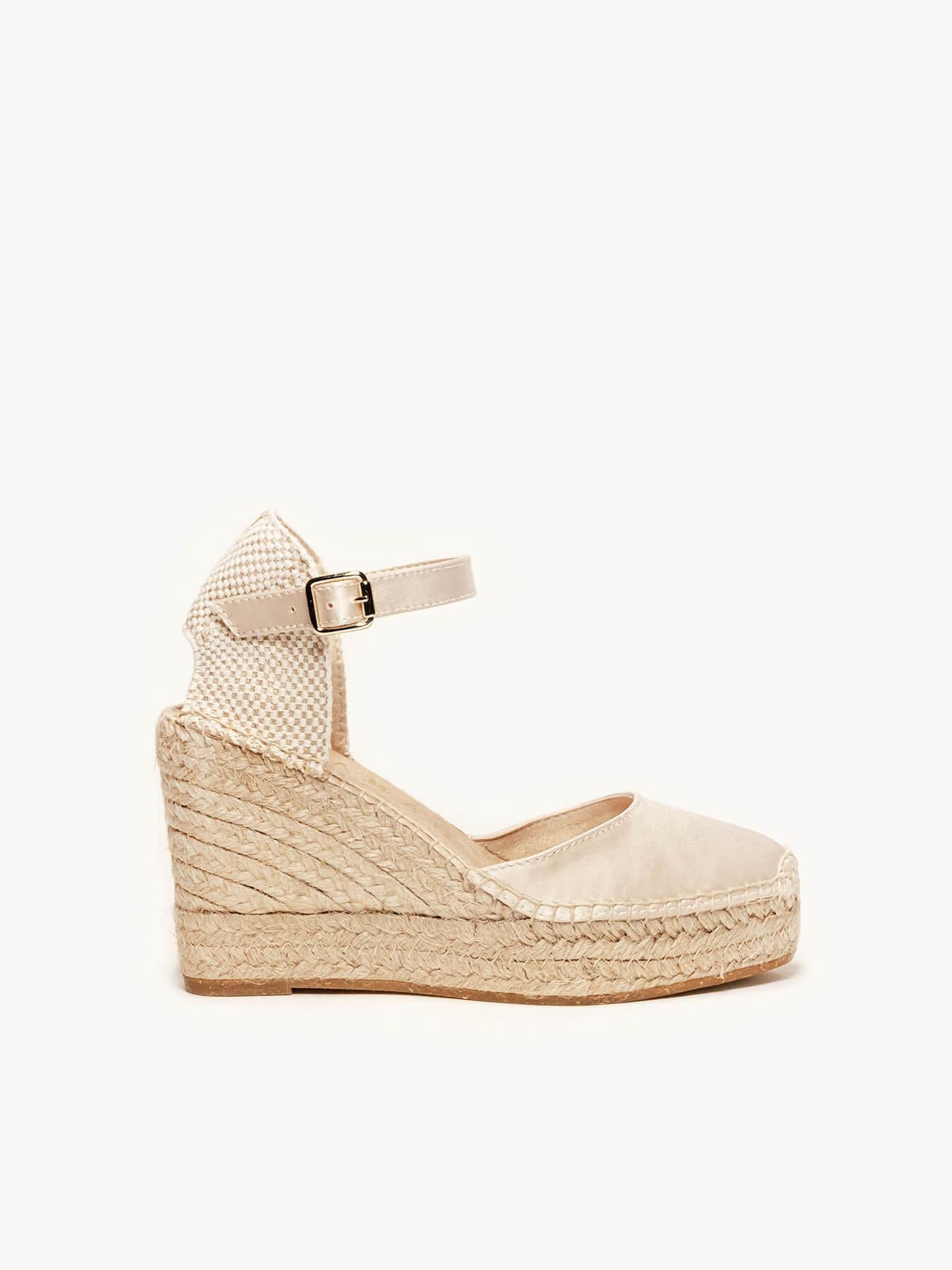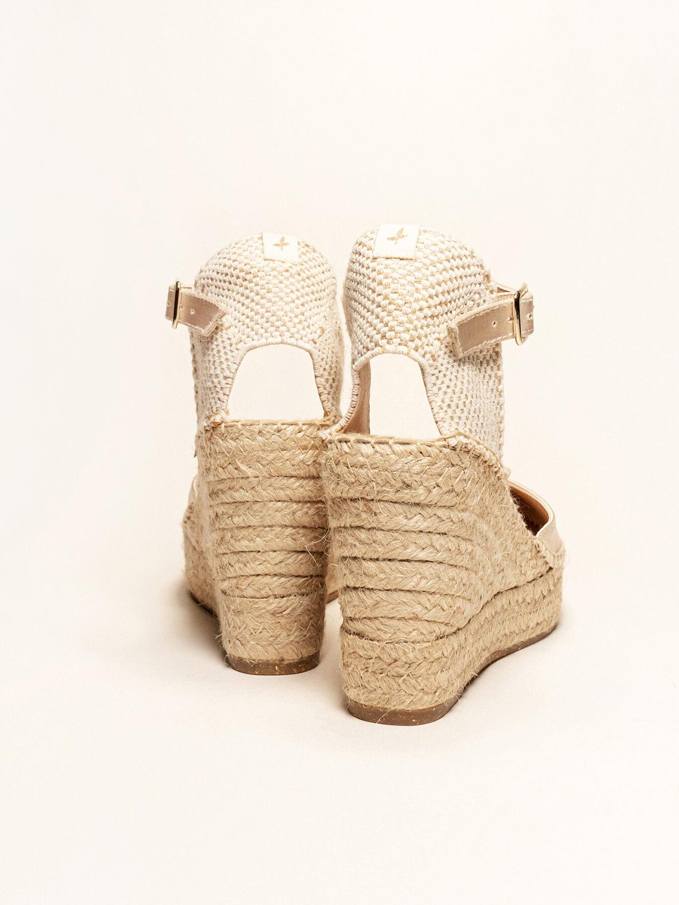 - Cuña de trenza de Yute natural con suela de goma reciclada mezclada con fibras naturales.