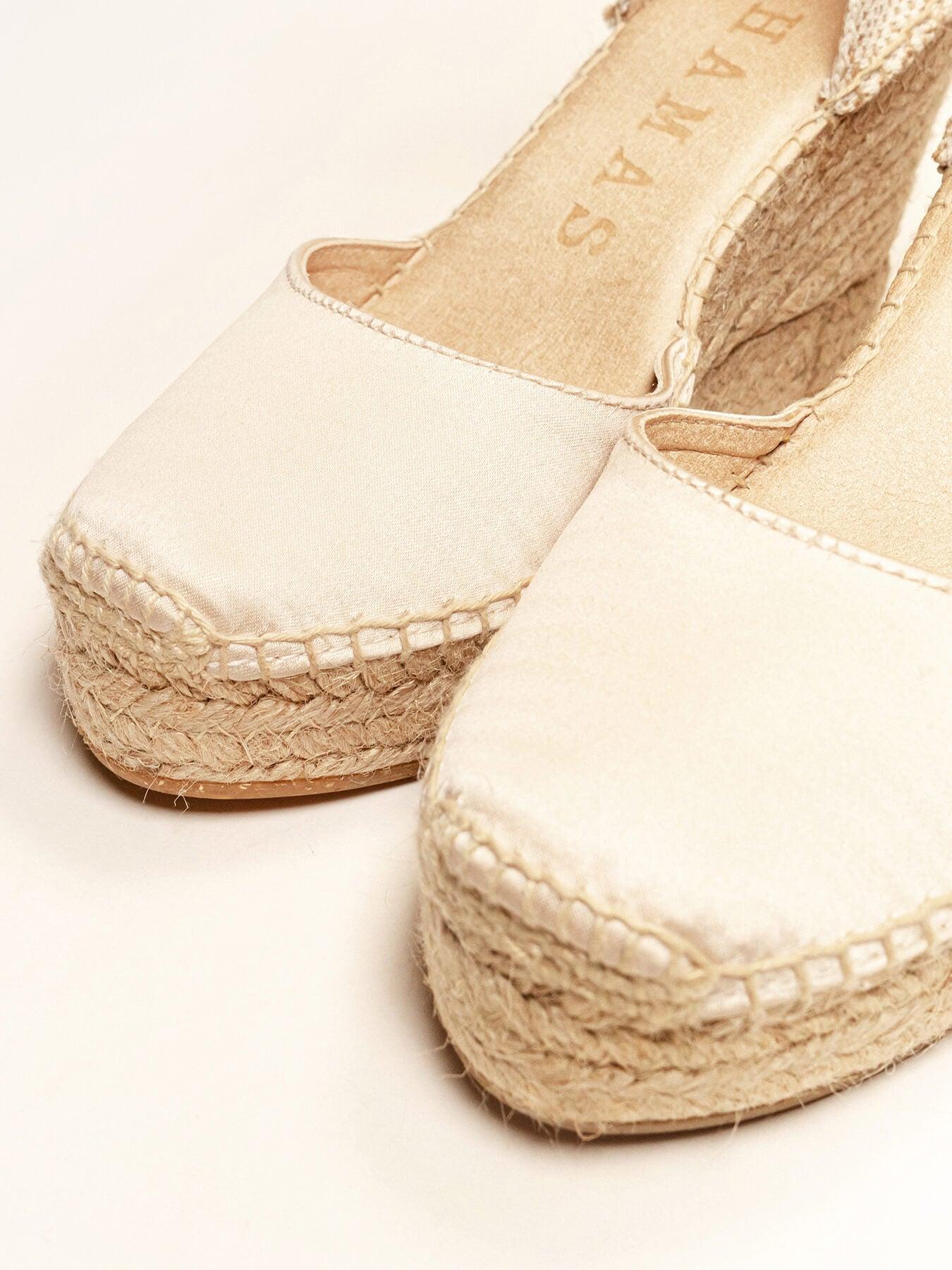 La alpargata de cuña alta Dalia, es uno de nuestros modelos más especiales, perfecto para tu día. Las alpargatas de novia que podrás elegir como primera opción o como alpargatas de cambio. Conservarás la altura, gracias a su pulsera las llevarás bien sujetas a tu pie y llevarás las alpargatas cómodas que te permitirán disfrutar al máximo.