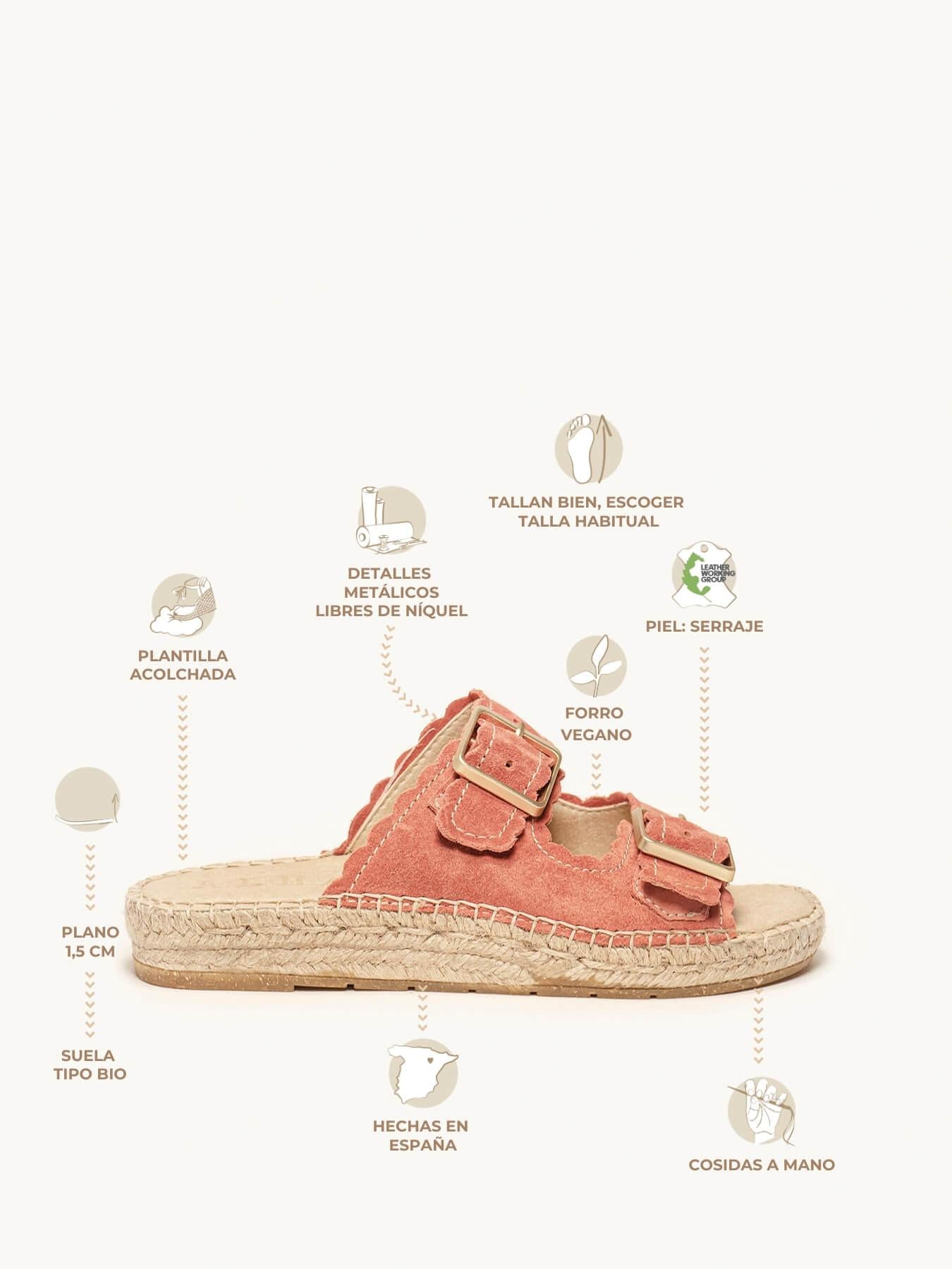 - Cuña de trenza de yute natural con suela de goma reciclada mezclada con fibras naturales.