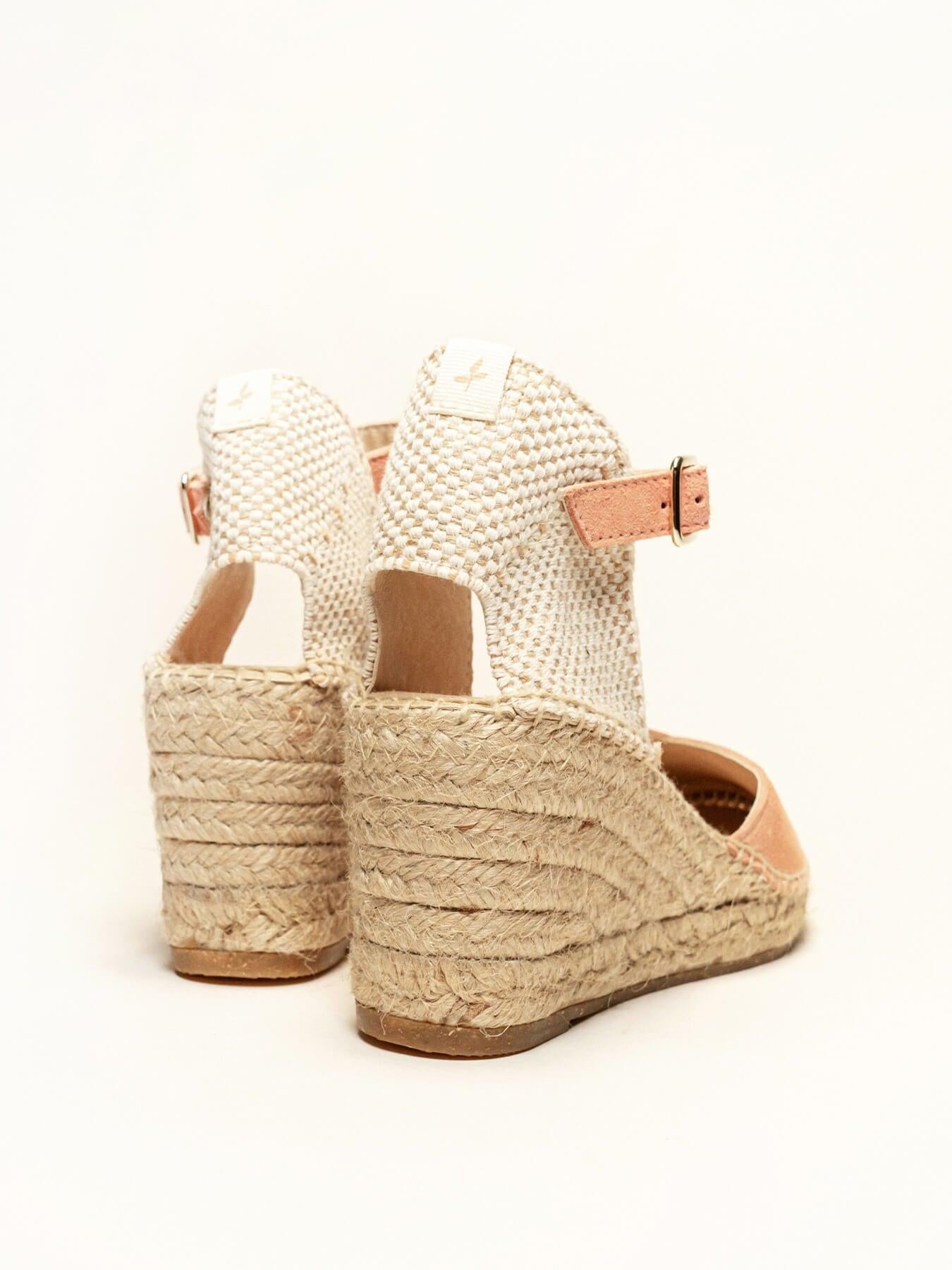 - Cuña de trenza de yute natural con suela de goma reciclada, mezclada con fibras naturales.
