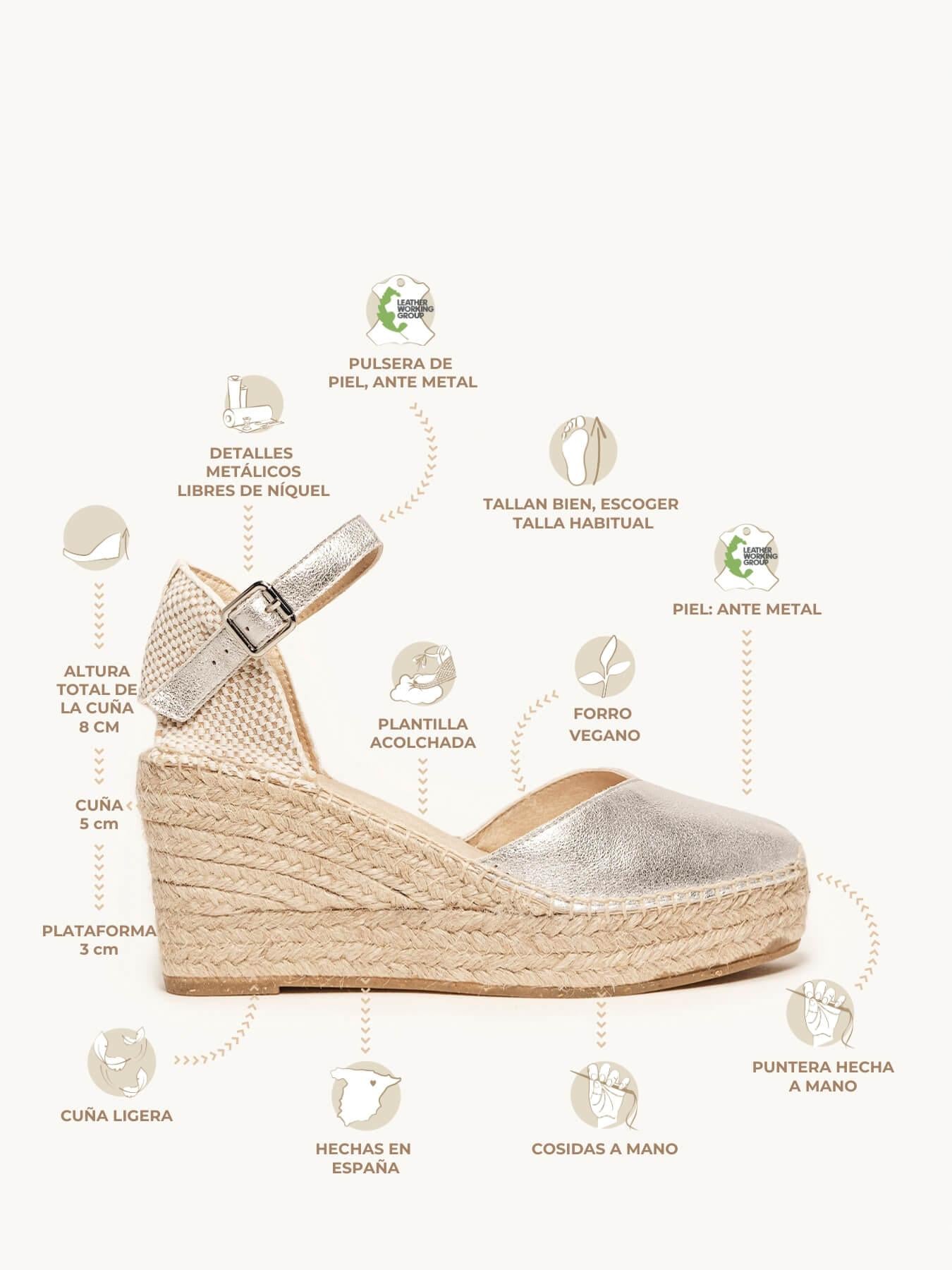 - El Ante Metal de la alpargata Jara está certificado por el Leather Working Group (una organización que promueve prácticas ambientales sostenibles)