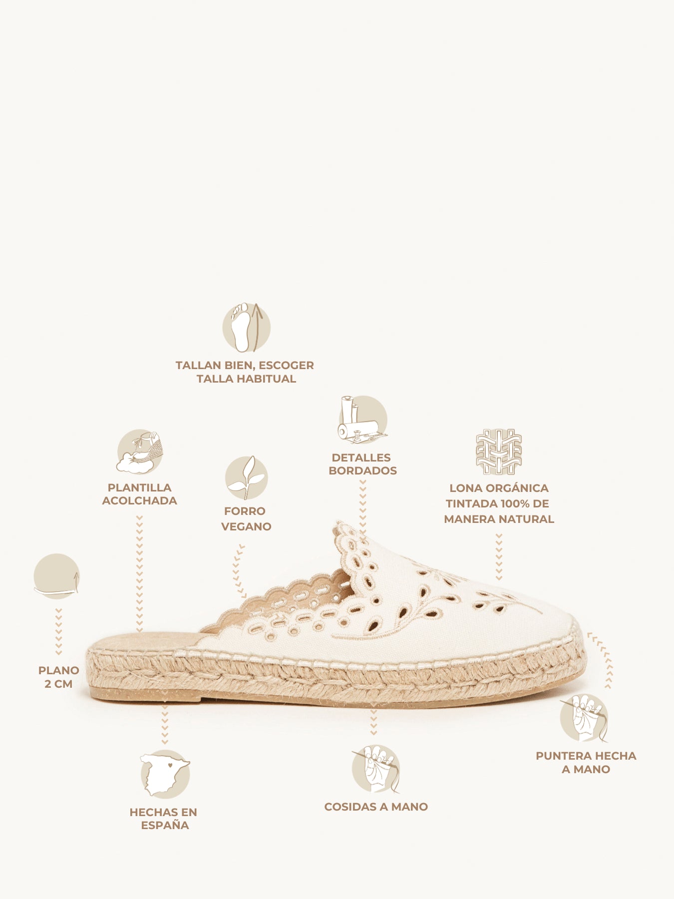 La alpargata plana Loto es nuestra babucha. Una alpargata de estilo slipper es un modelo muy versátil, ideal para el día a día y también para darle un toque muy chic a los looks más especiales. Irás súper cómoda durante todo el día y verás tu pie súper estilizado.