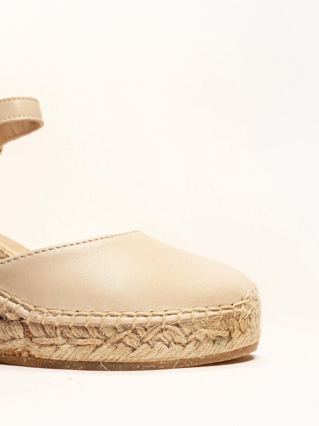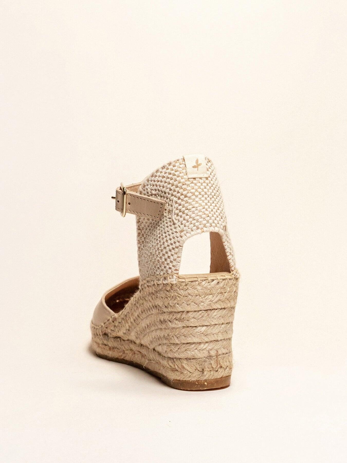 - Cuña de trenza de Yute natural con suela de goma reciclada mezclada con fibras naturales.