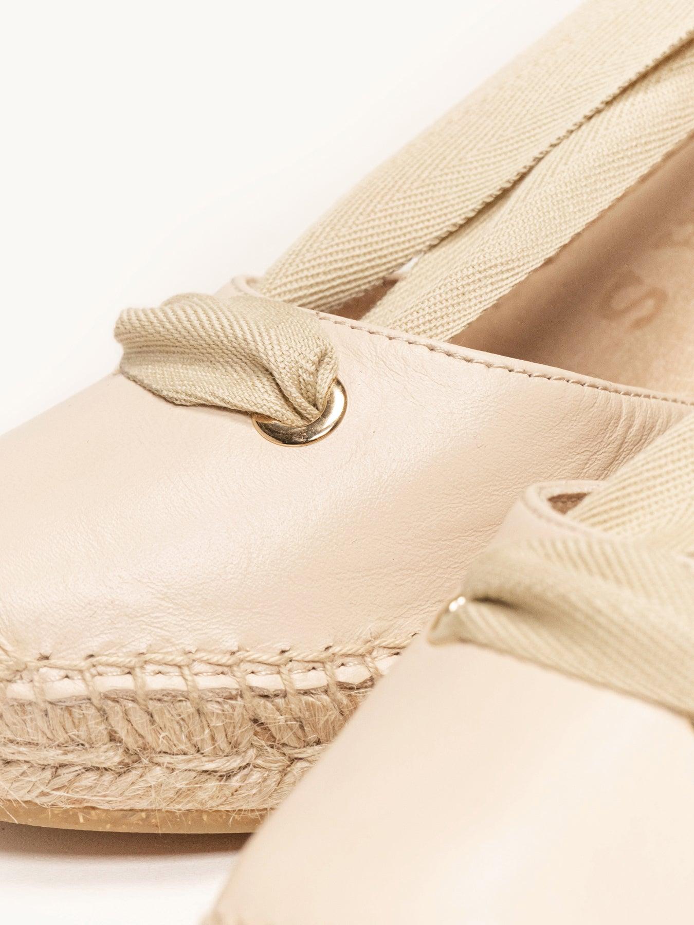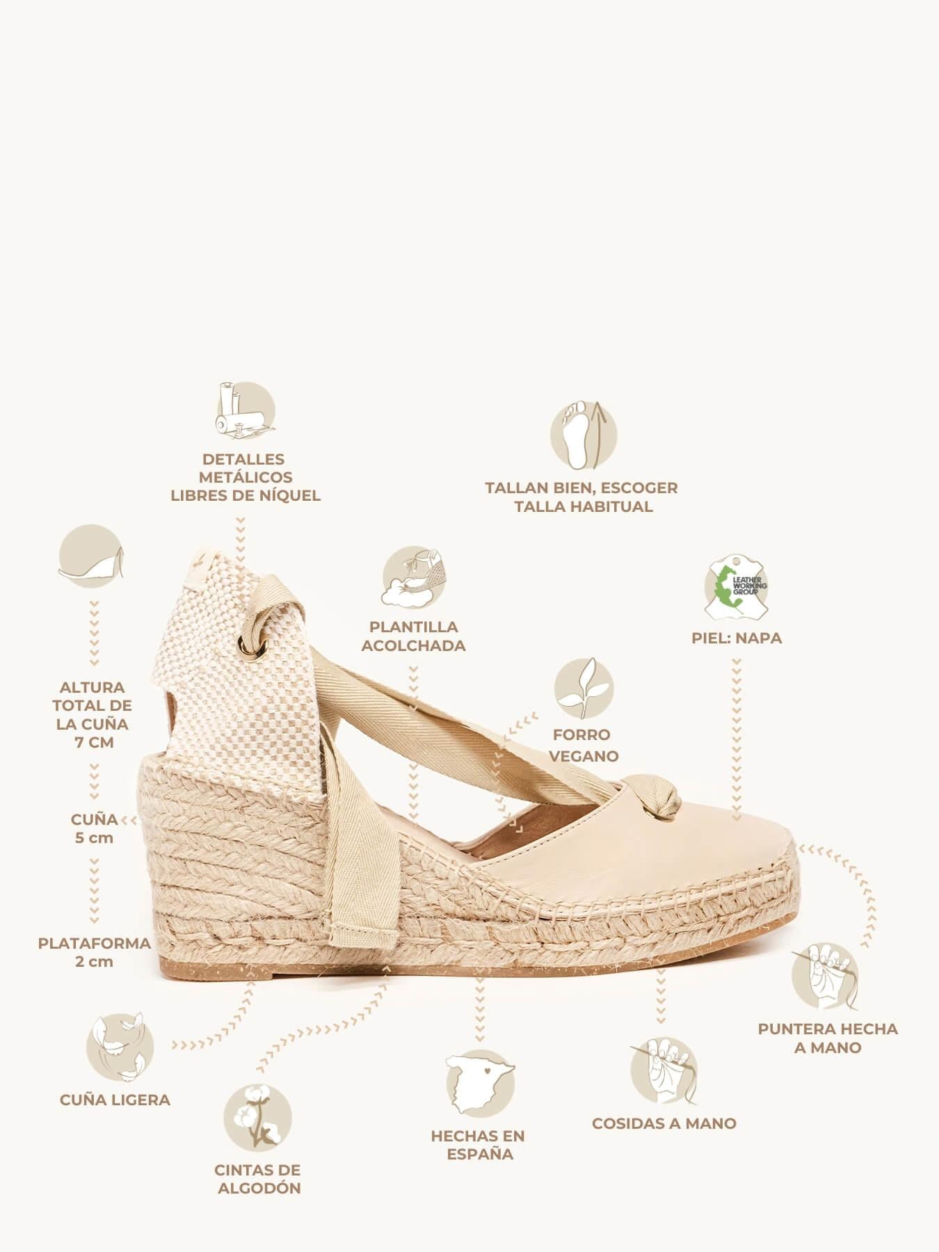 - Cuña de trenza de Yute natural con suela de goma reciclada mezclada con fibras naturales.