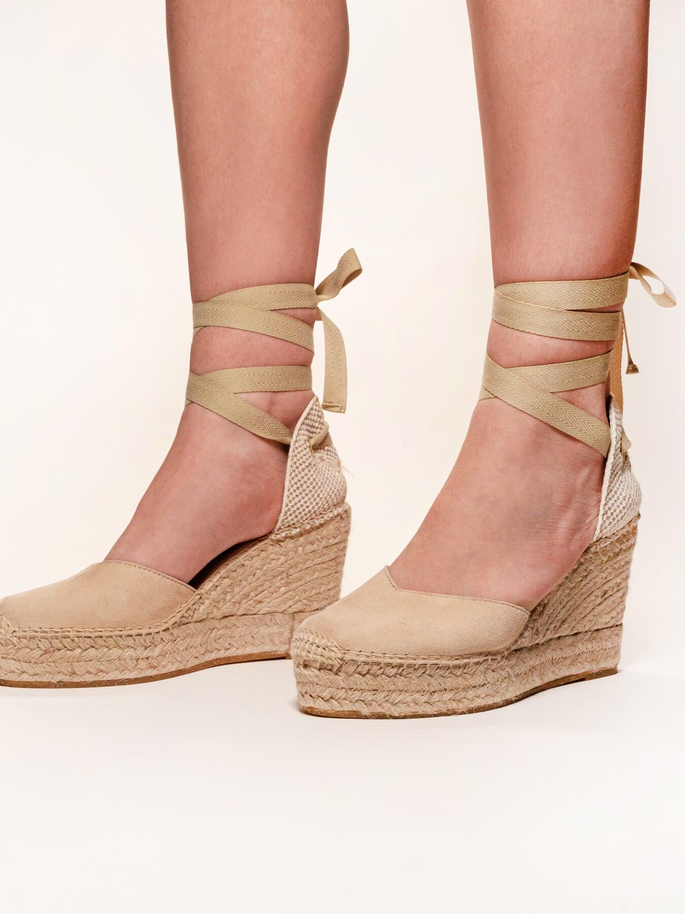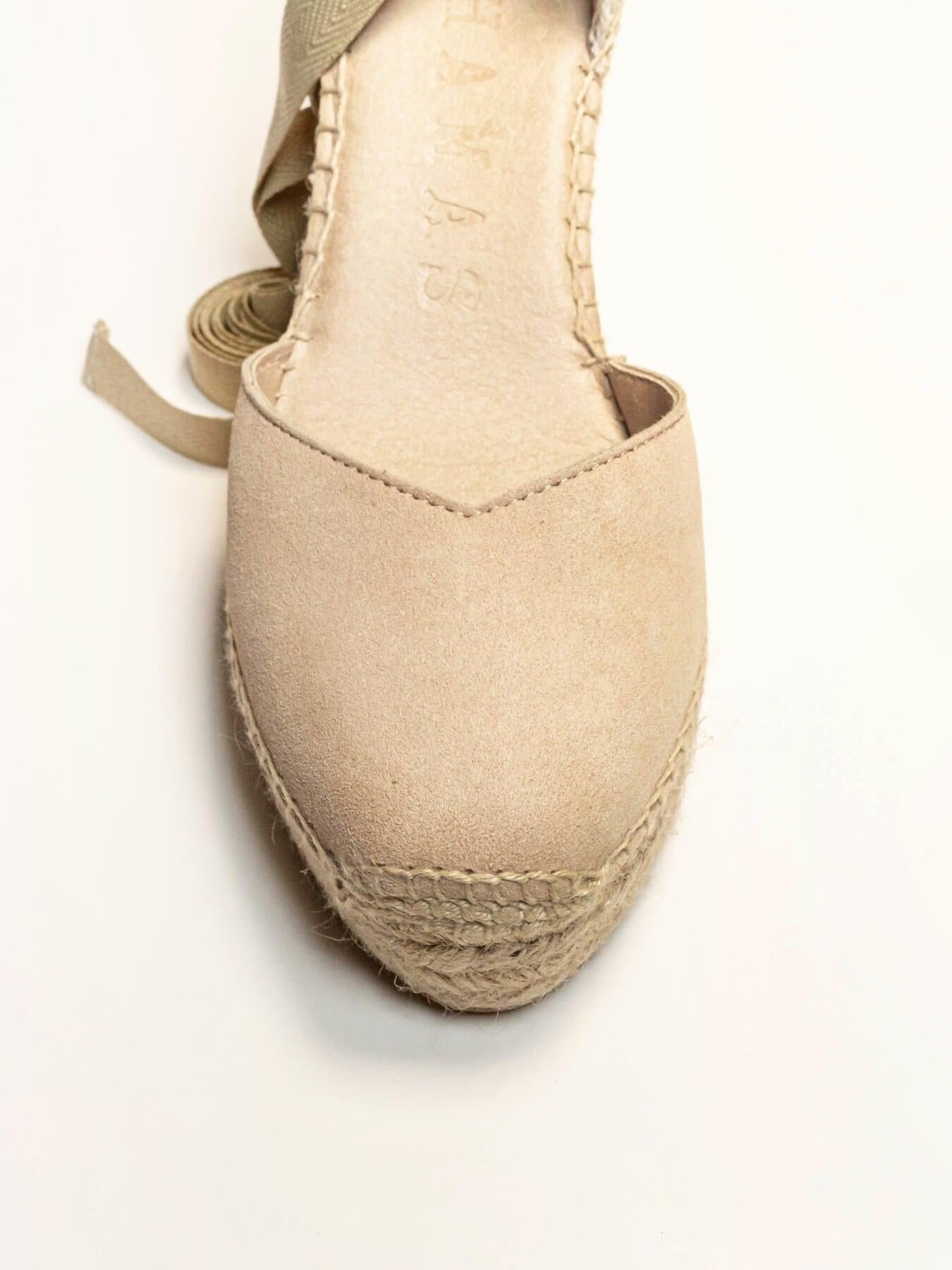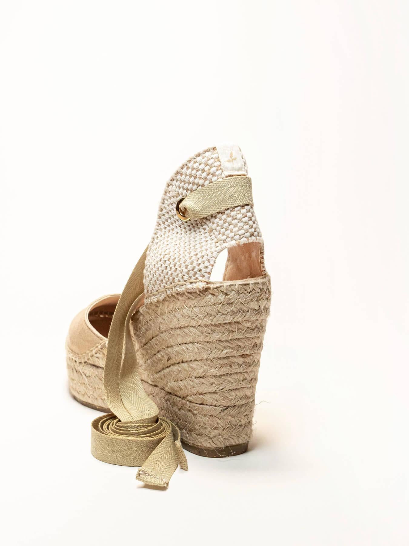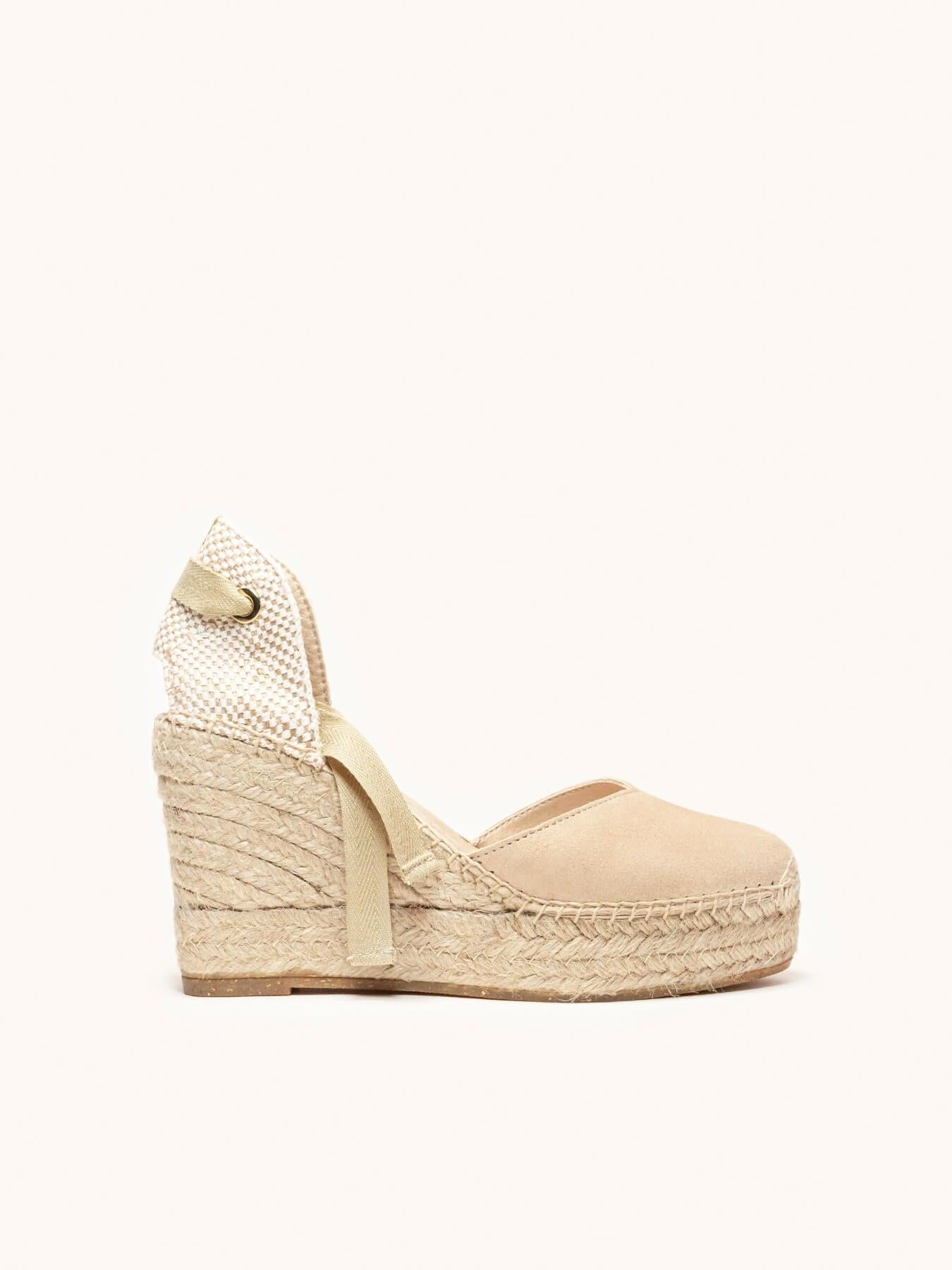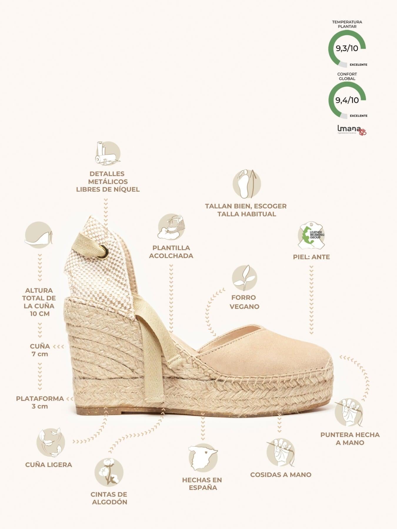 - Cuña de trenza de yute natural con suela de goma reciclada mezclada con fibras naturales.