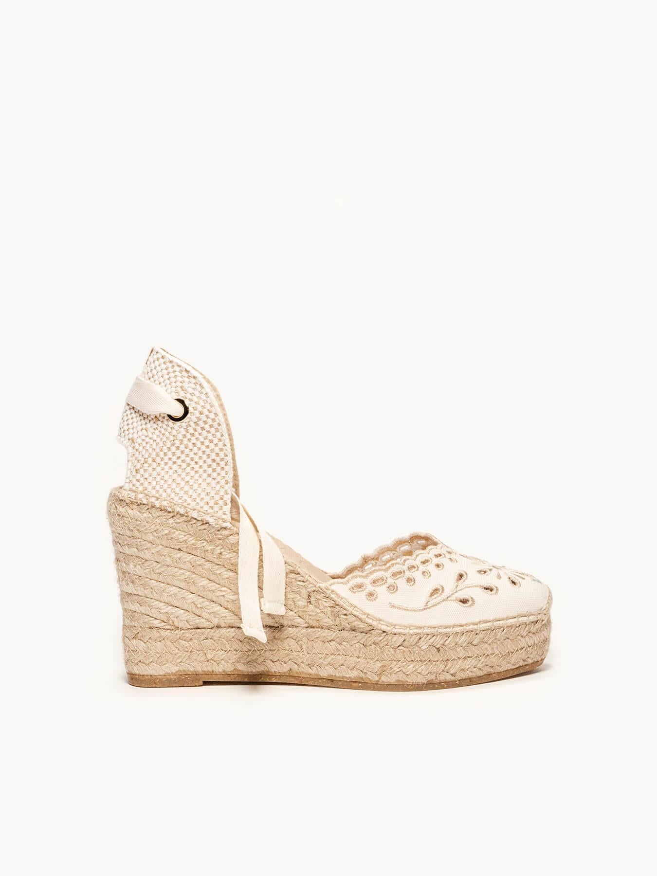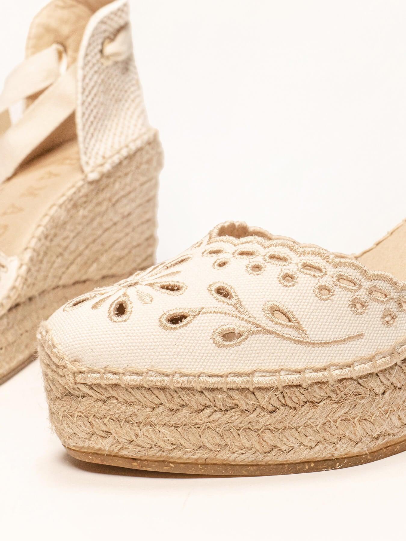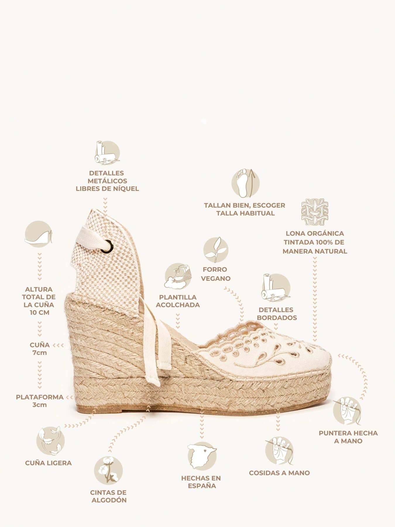 - Cuña de trenza de Yute natural con suela de goma reciclada mezclada con fibras naturales.
