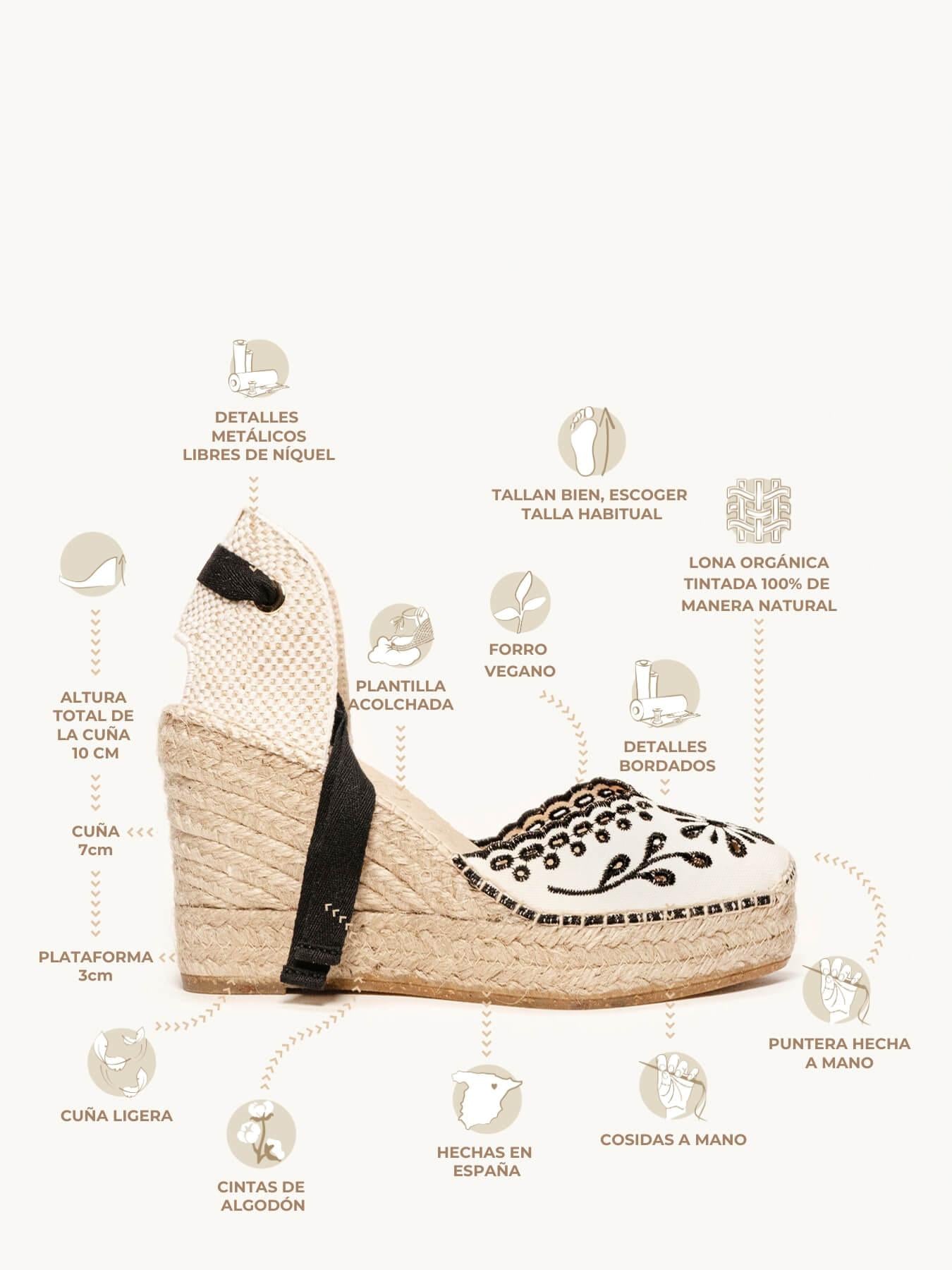 - Cuña de trenza de Yute natural con suela de goma reciclada mezclada con fibras naturales.
