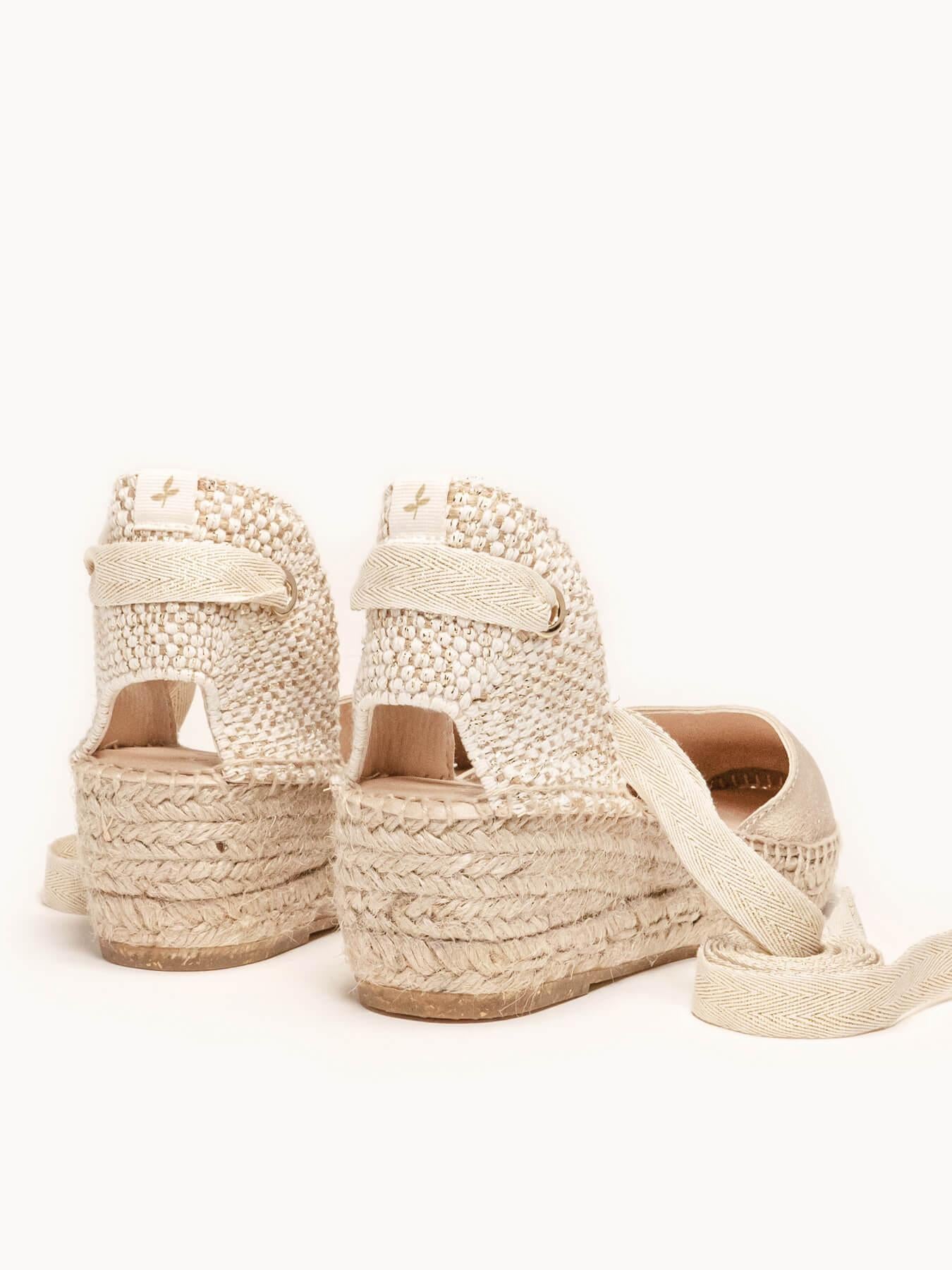 - Cuña de trenza de yute natural con suela de goma reciclada mezclada con fibras naturales.