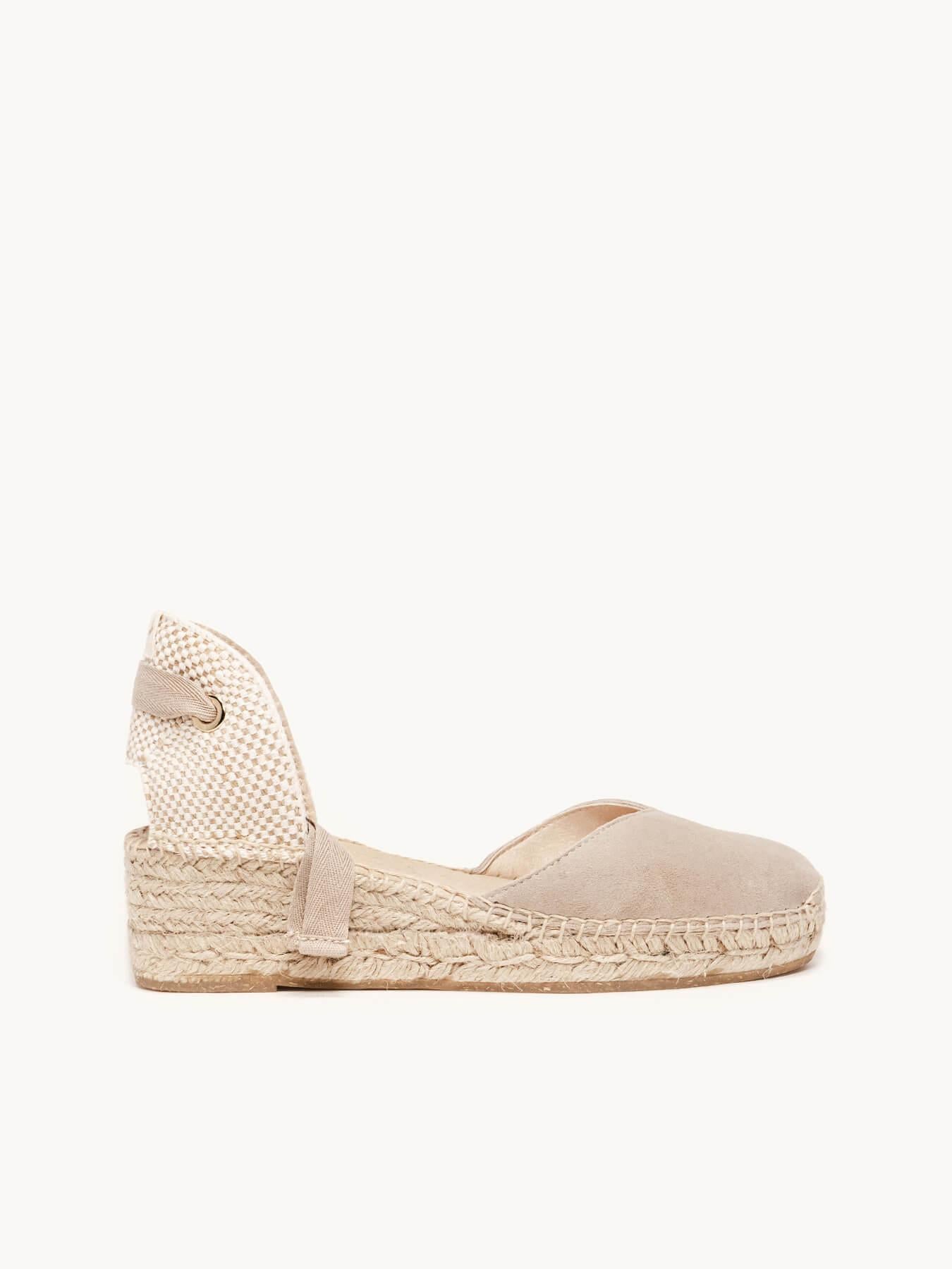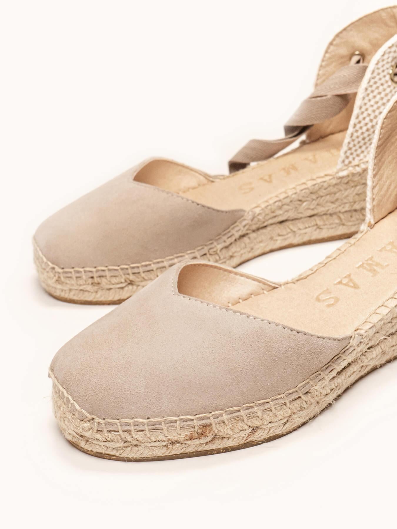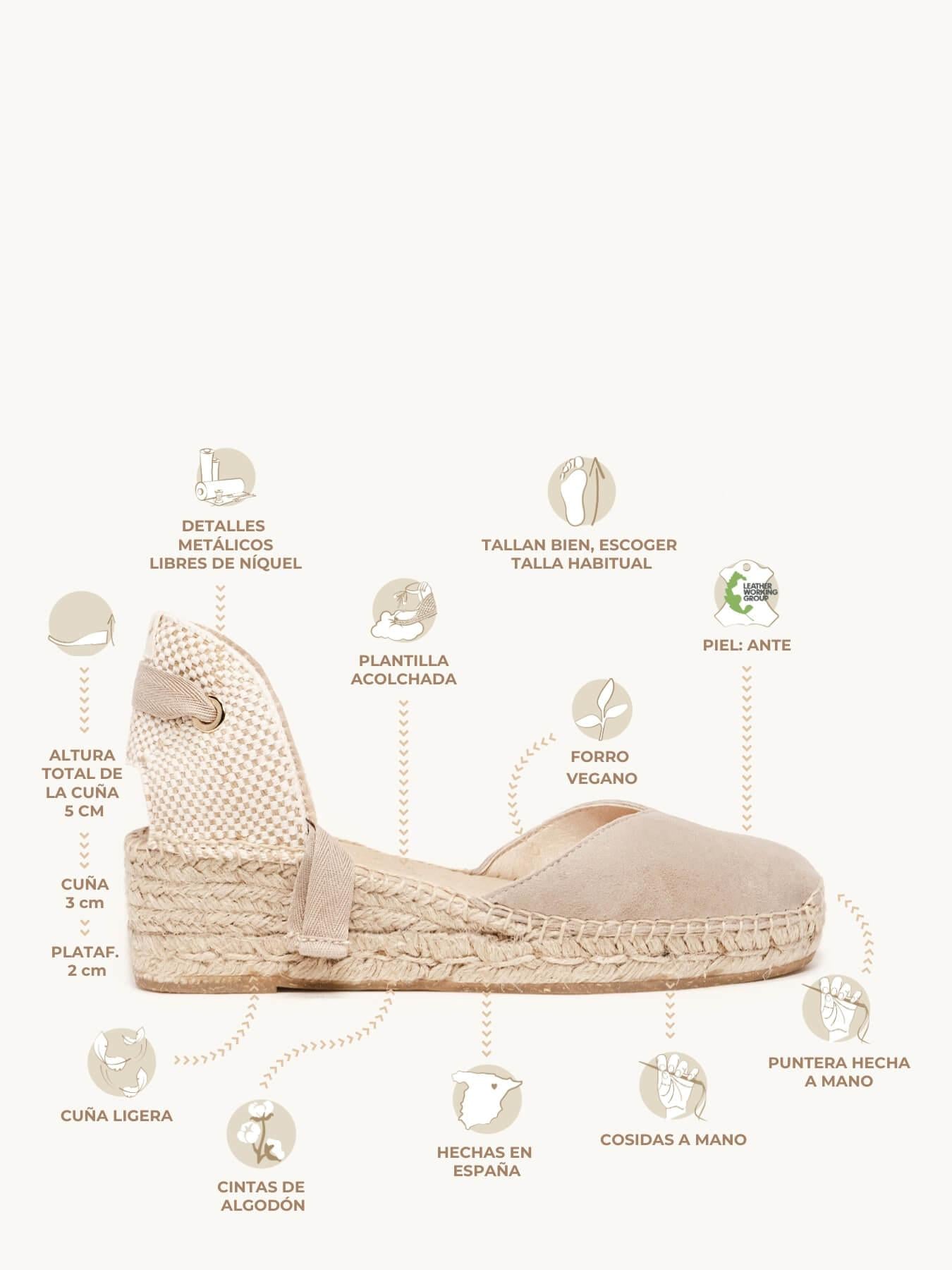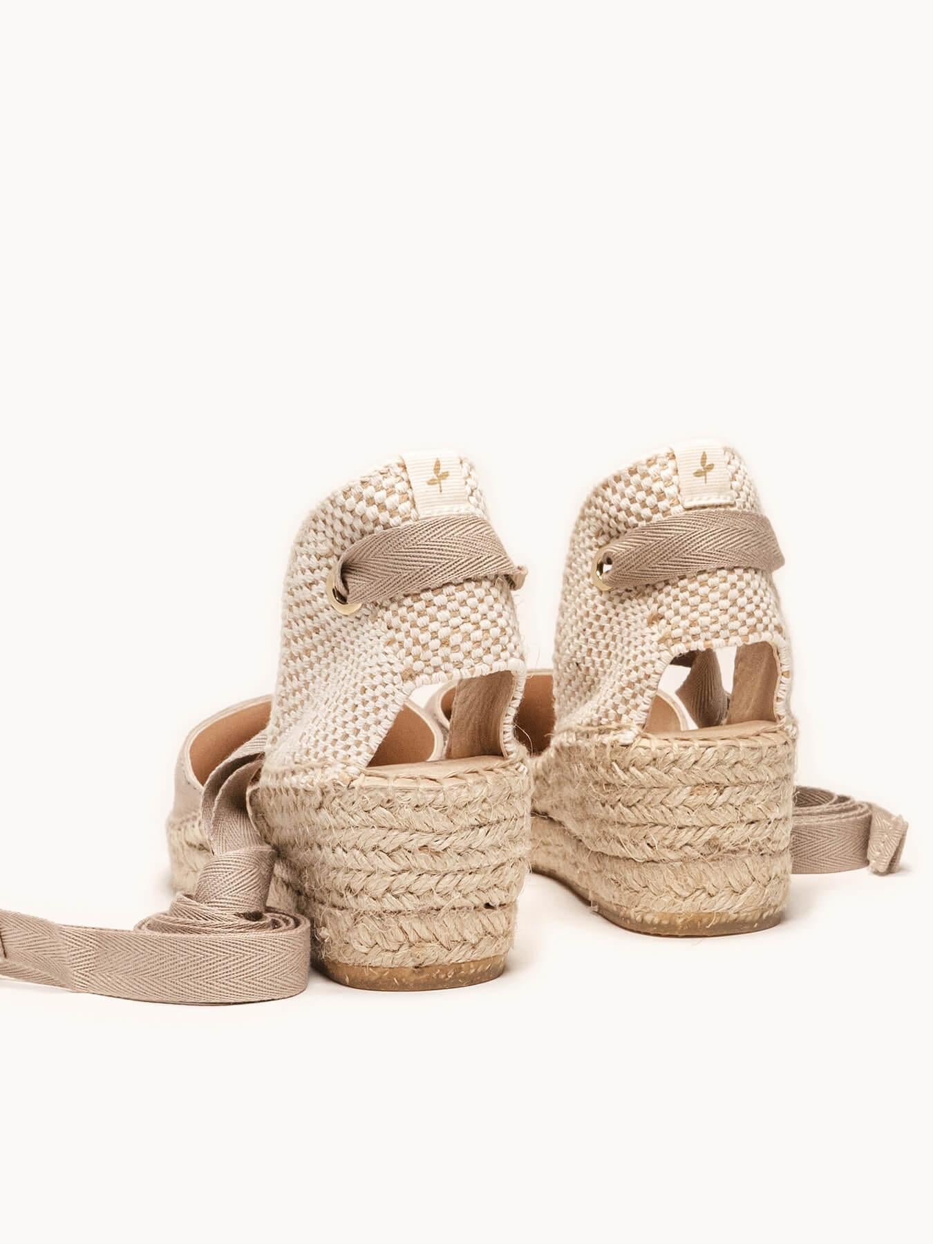 - Cuña de trenza de Yute natural con suela de goma reciclada mezclada con fibras naturales.