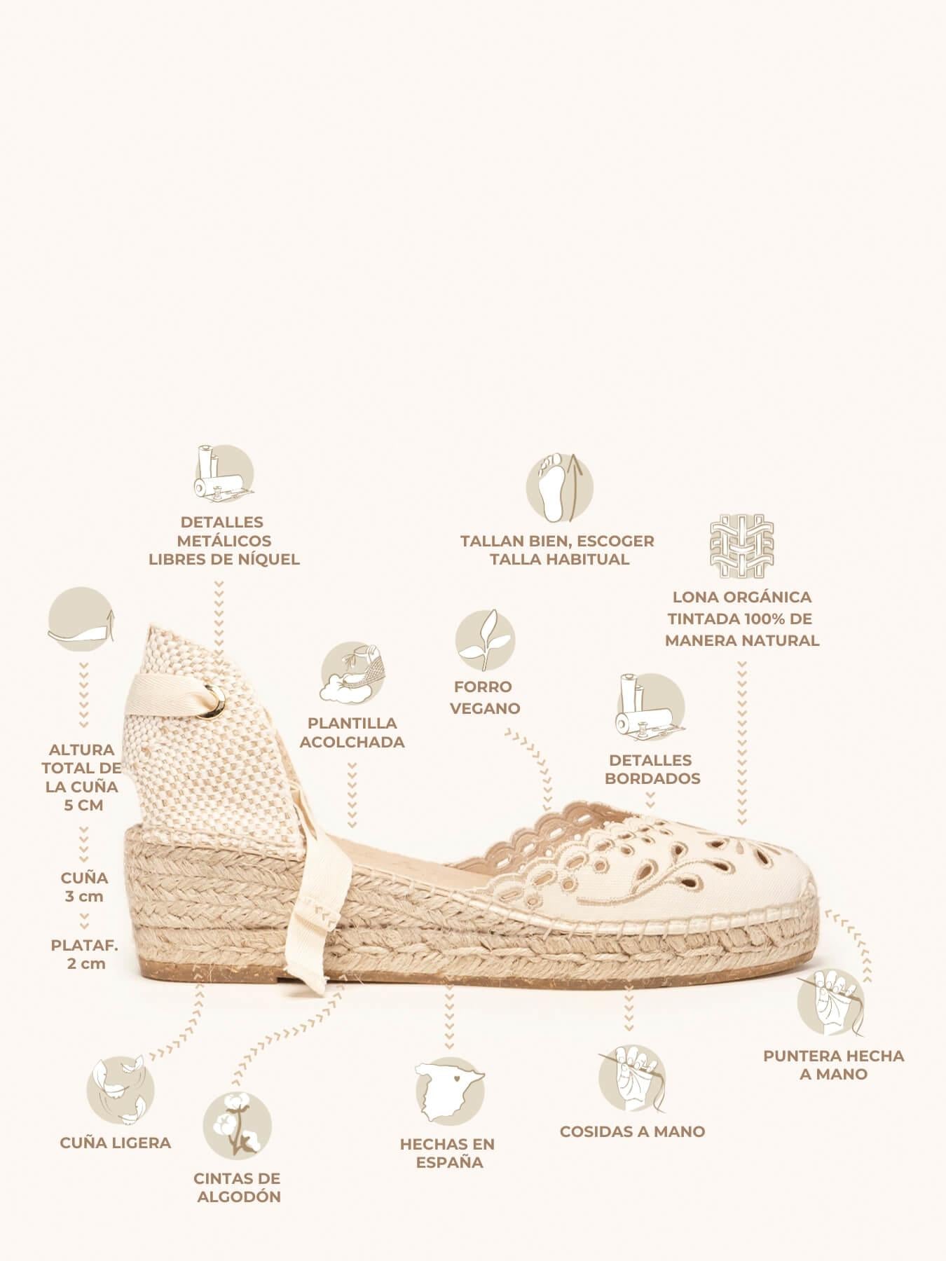 - Cuña de trenza de Yute natural con suela de goma reciclada mezclada con fibras naturales.