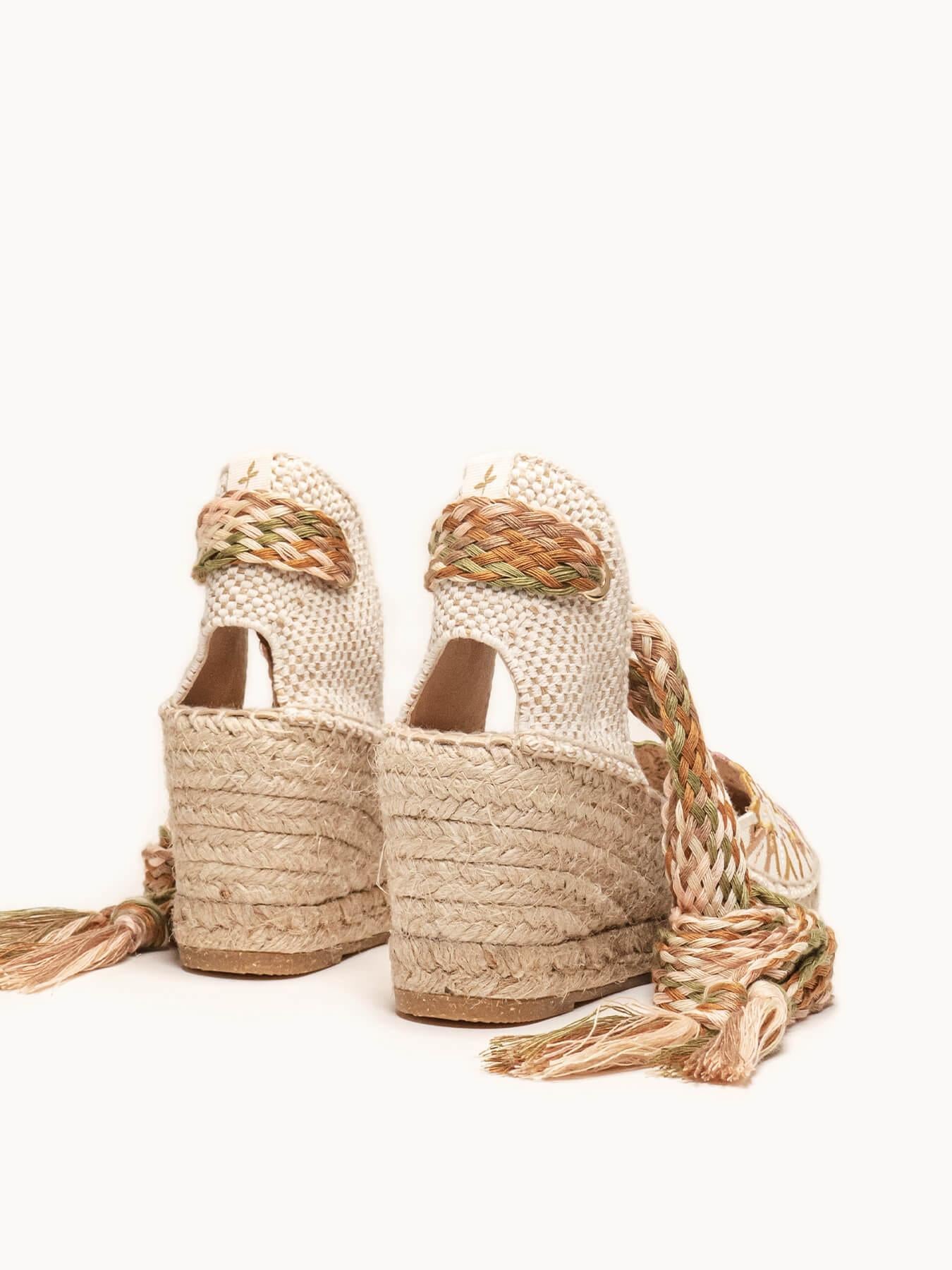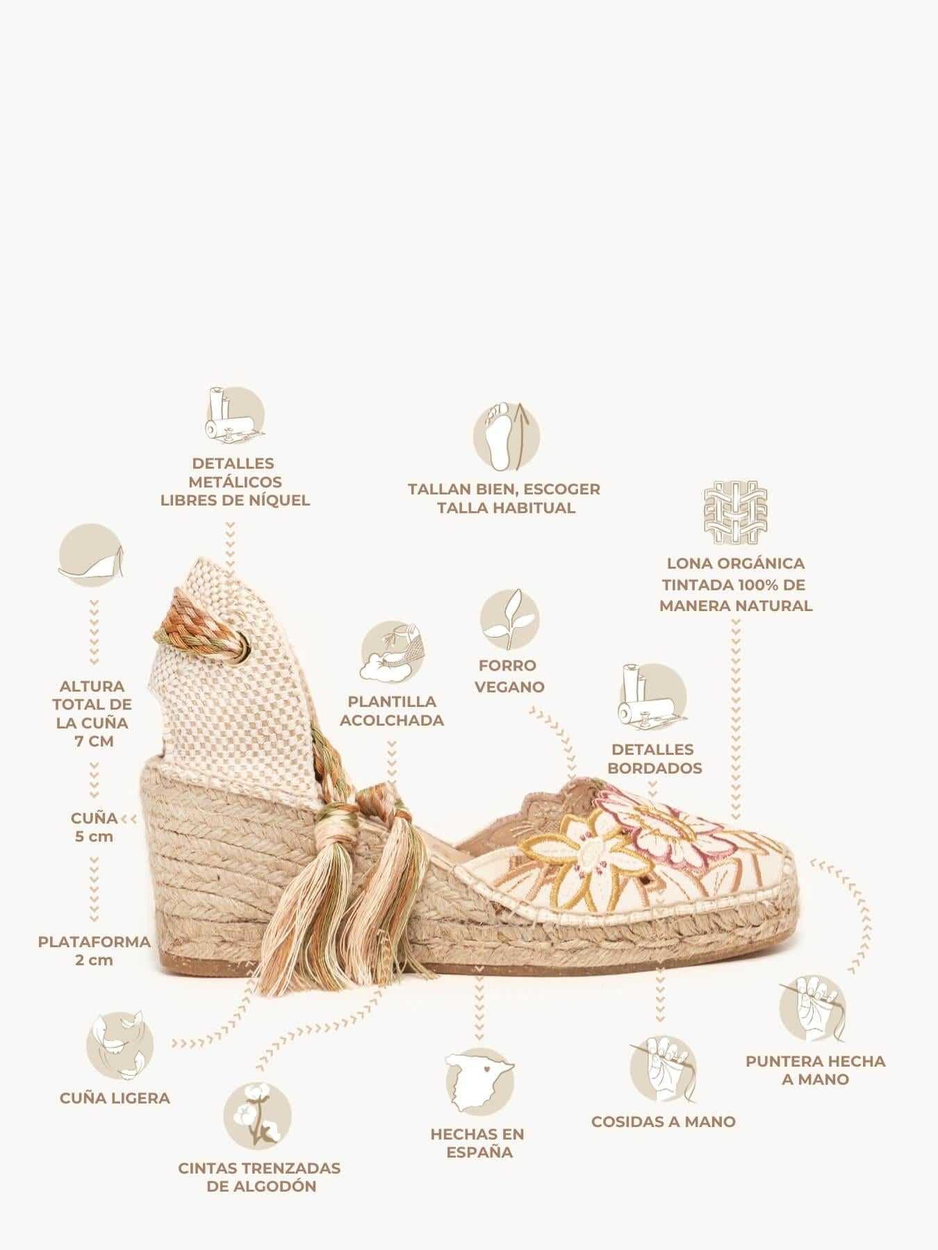 - Cuña de trenza de Yute natural con suela de goma reciclada mezclada con fibras naturales.
