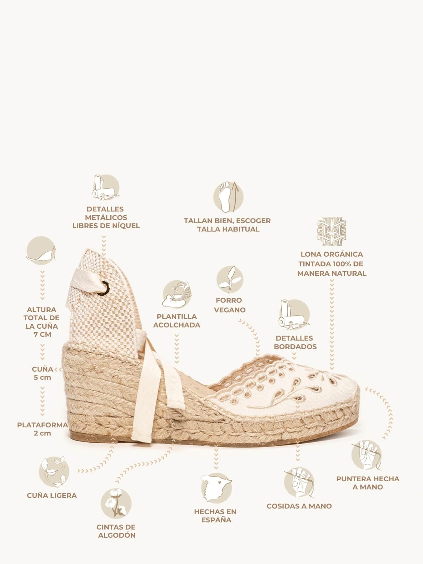 - Cuña de trenza de Yute natural con suela de goma reciclada mezclada con fibras naturales.