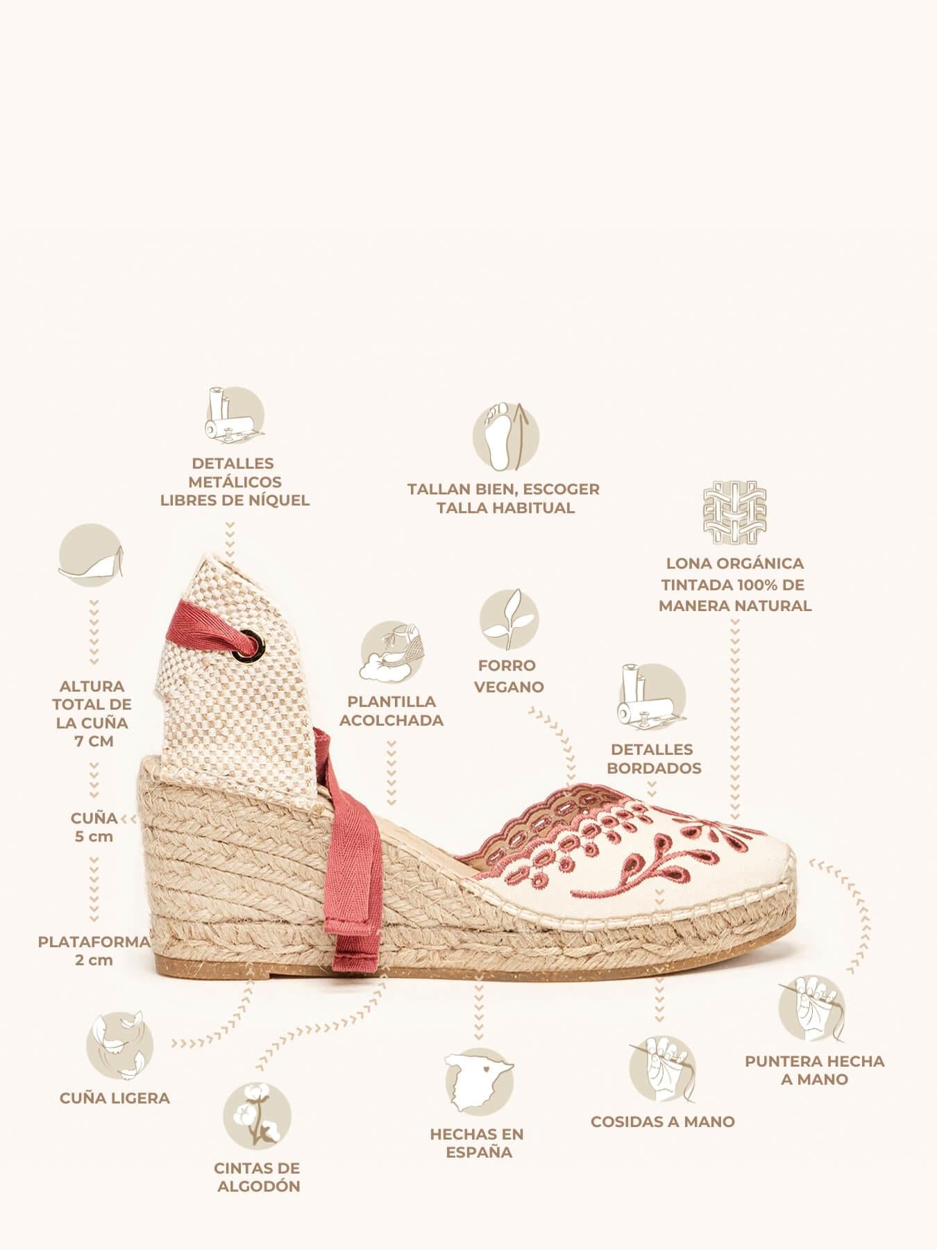 - El tejido bordado de la alpargata Romero es de algodón orgánico tintado con tintes 100% naturales.