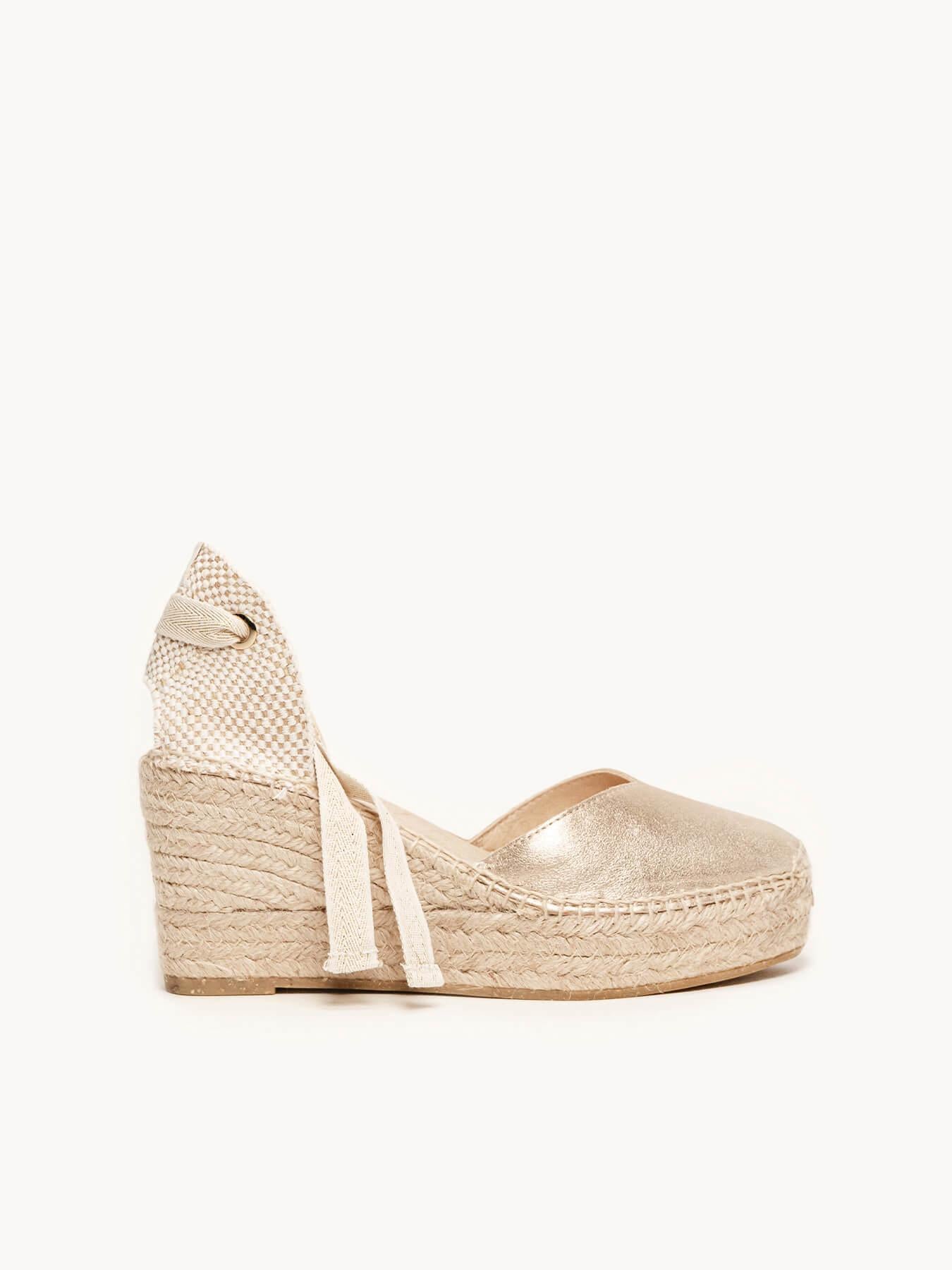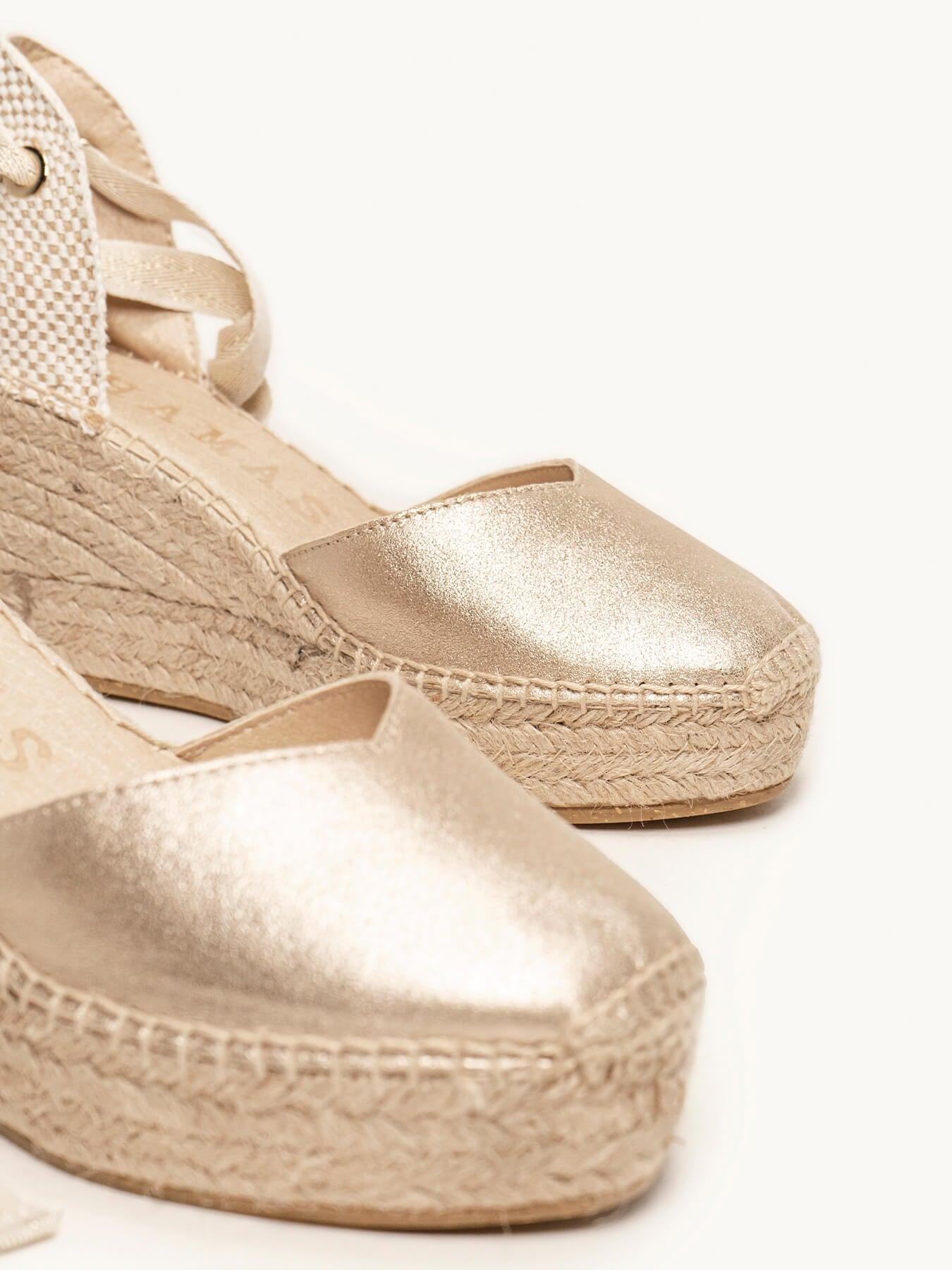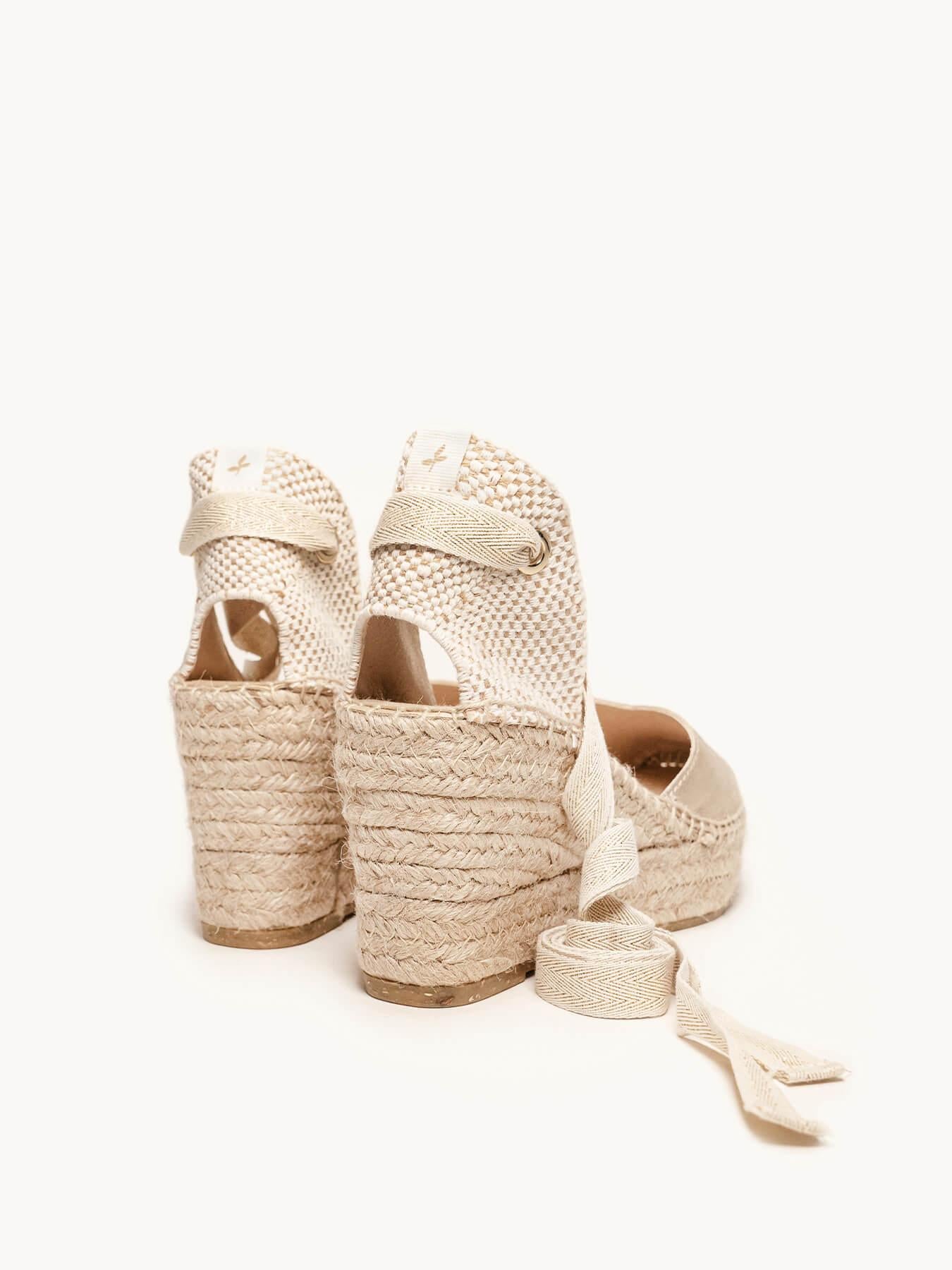 - Cuña de trenza de Yute natural con suela de goma reciclada mezclada con fibras naturales.