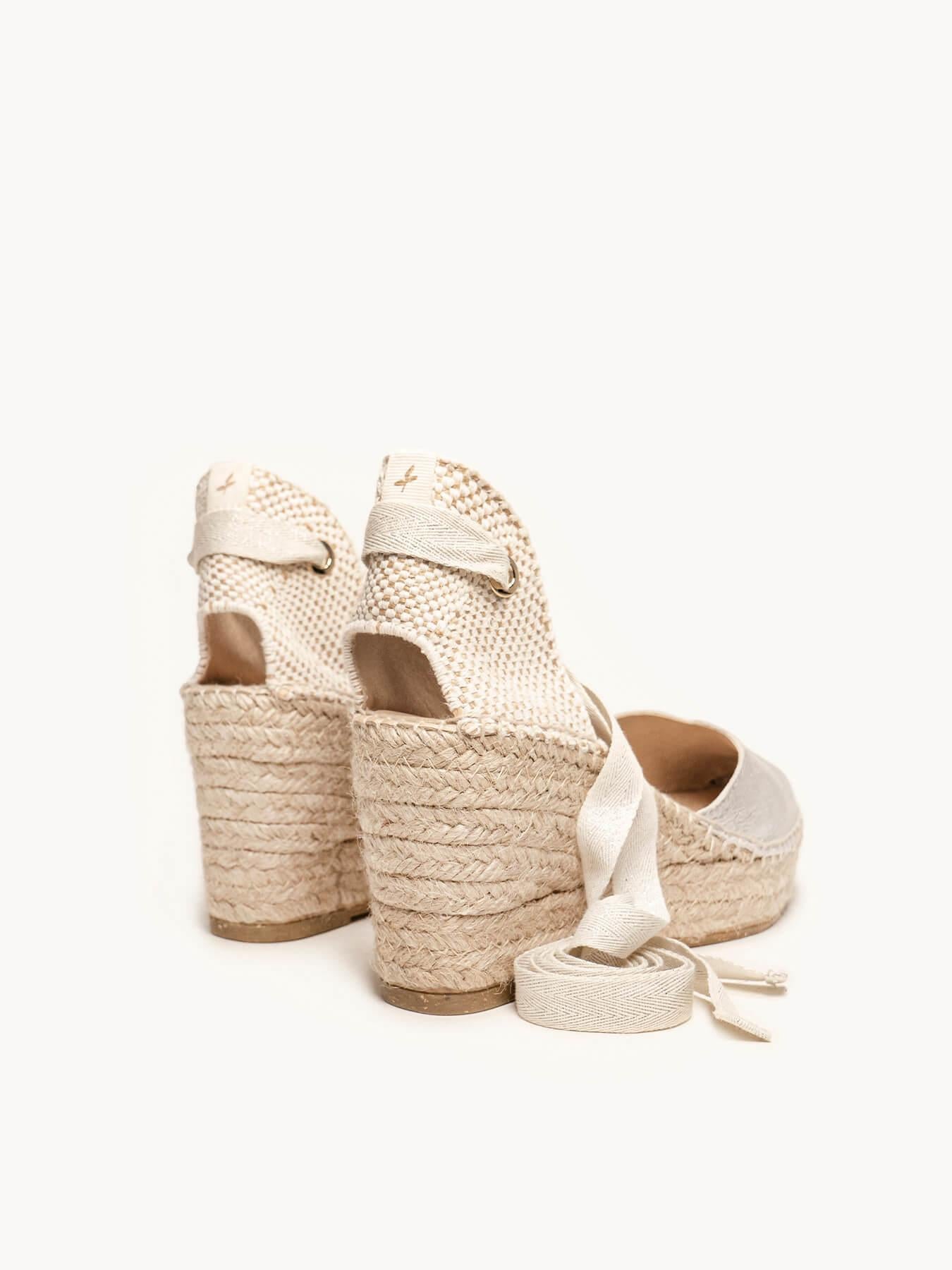 - Cuña de trenza de Yute natural con suela de goma reciclada mezclada con fibras naturales.