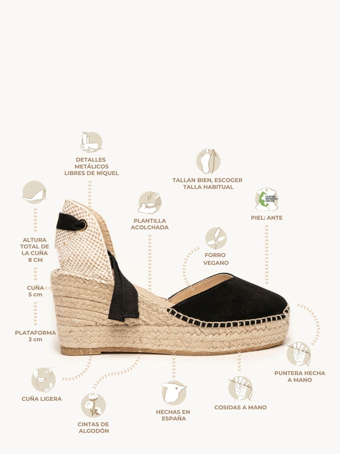 - Cuña de trenza de Yute natural con suela de goma reciclada mezclada con fibras naturales.