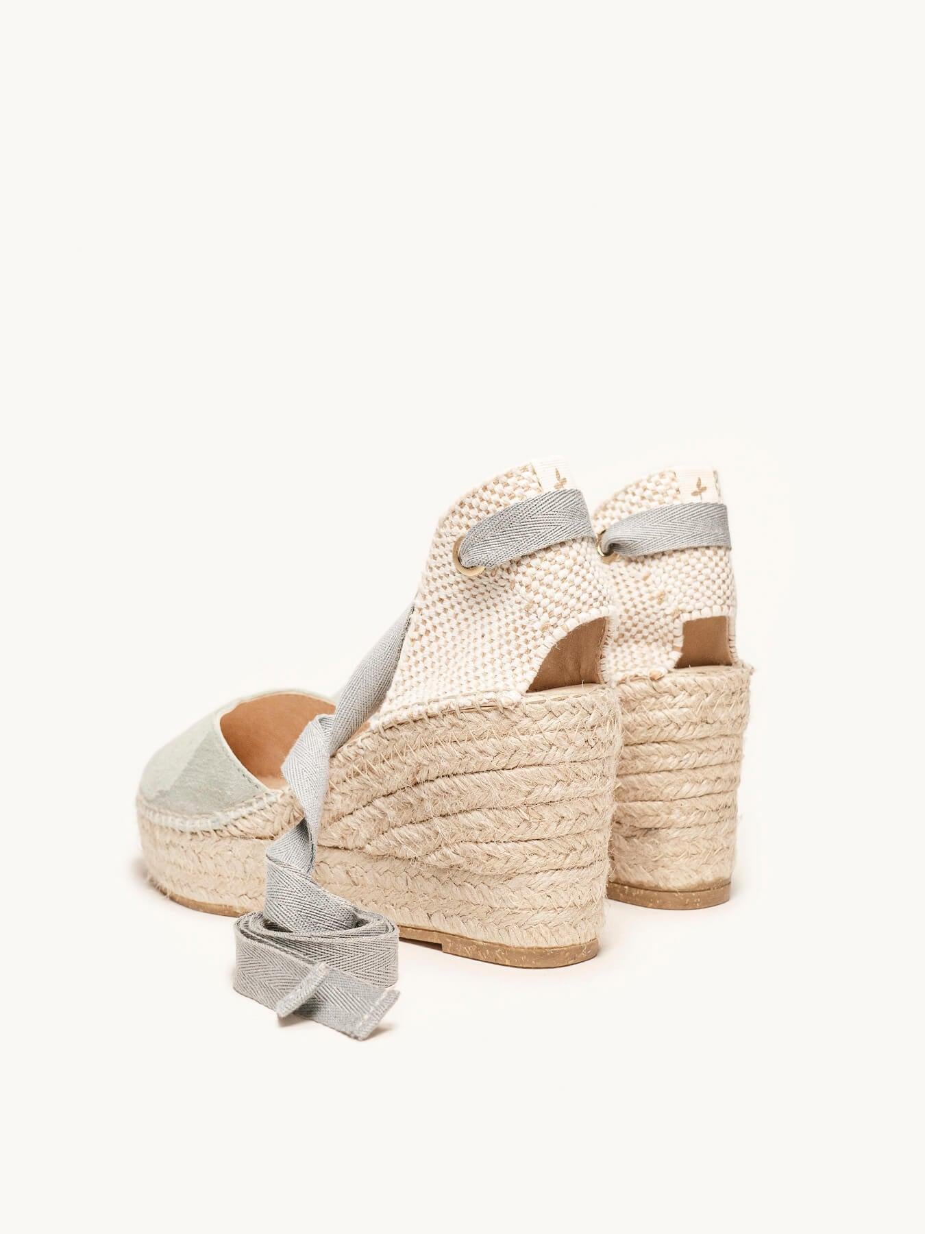 - Cuña de trenza de Yute natural con suela de goma reciclada mezclada con fibras naturales.