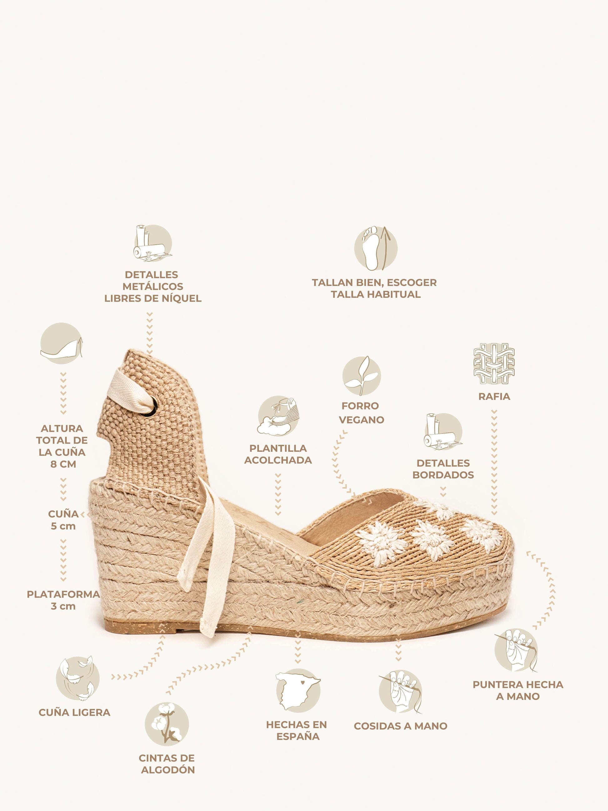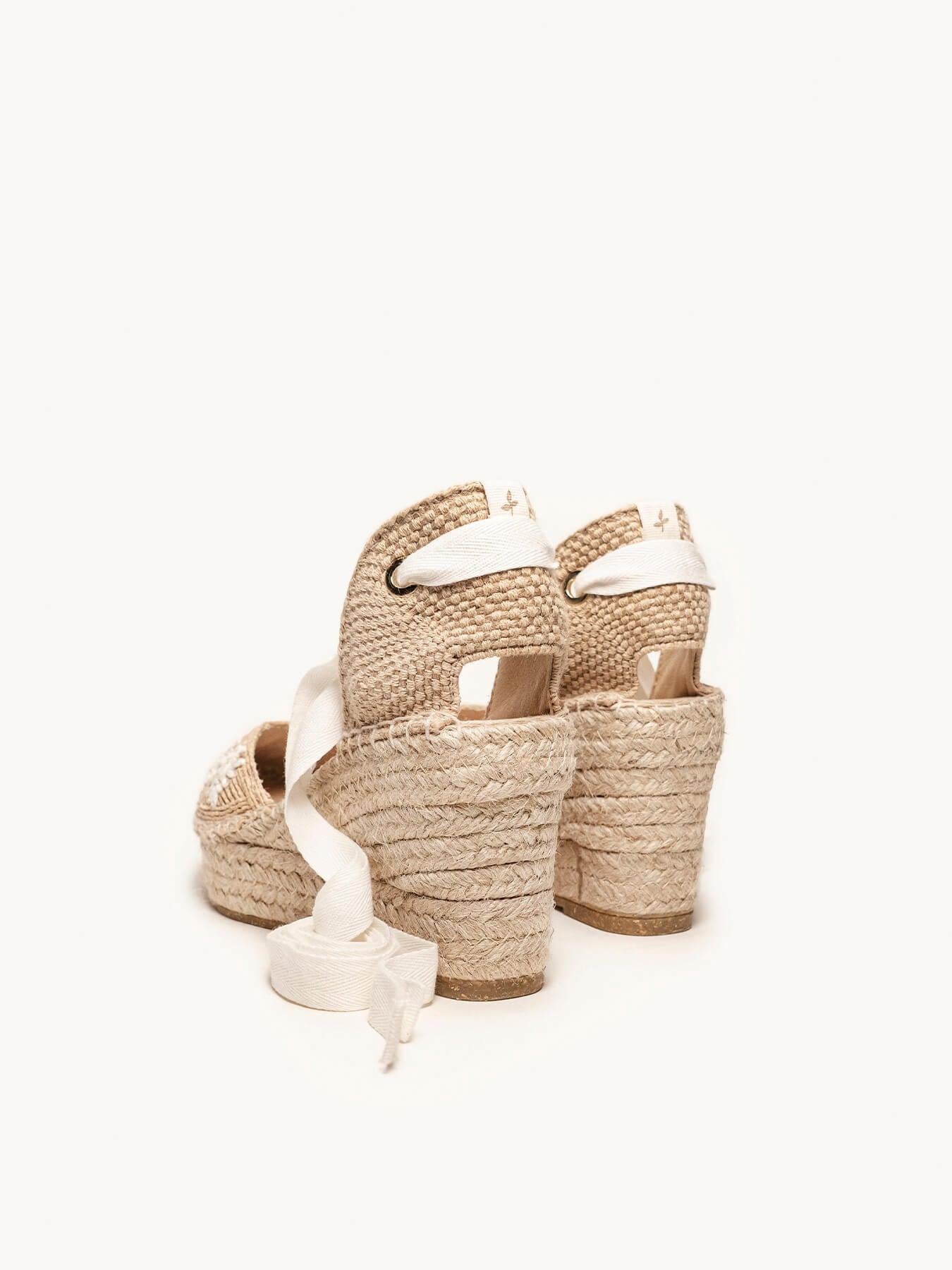 - Cuña de trenza de yute natural con suela de goma reciclada mezclada con fibras naturales.