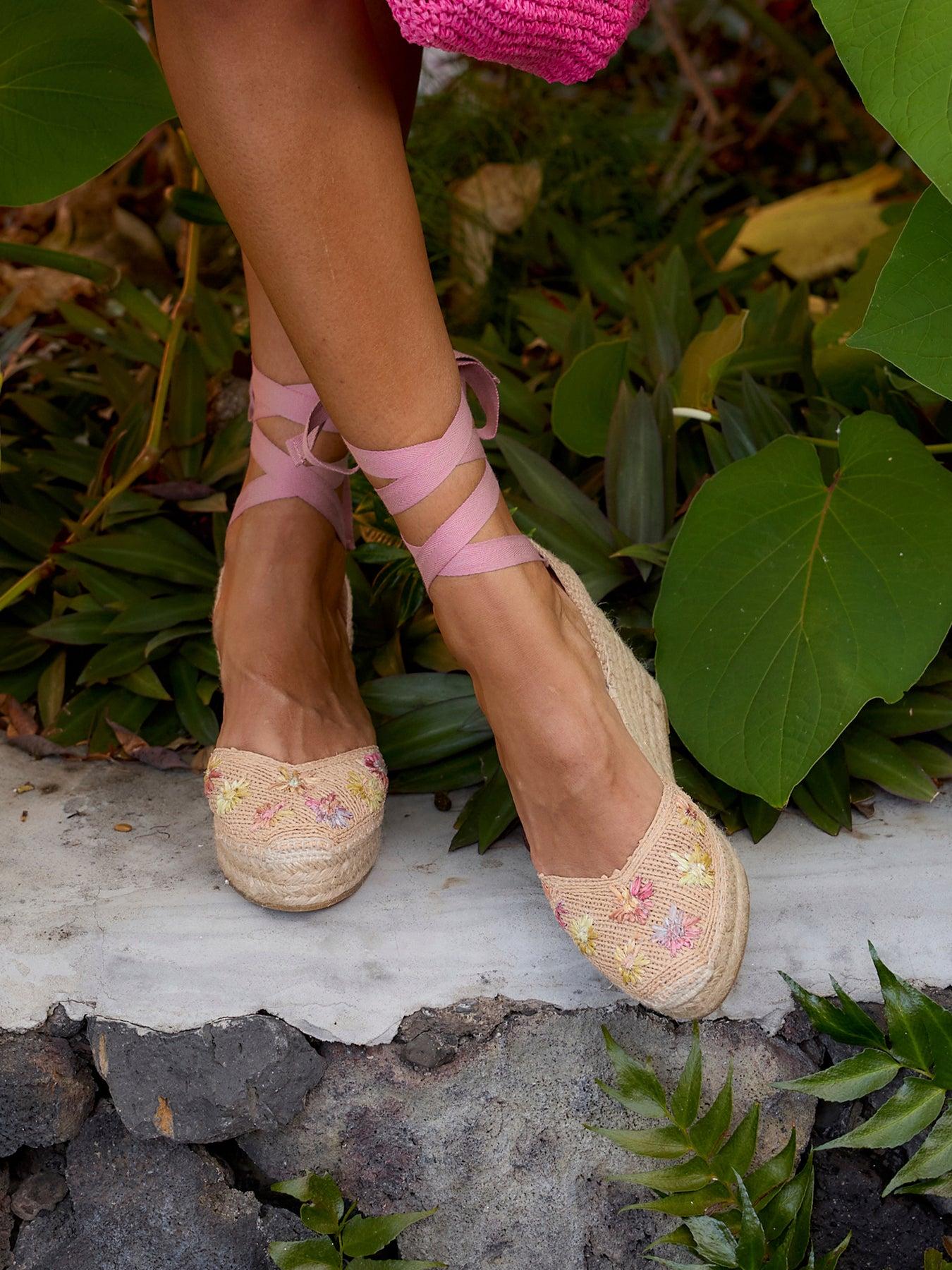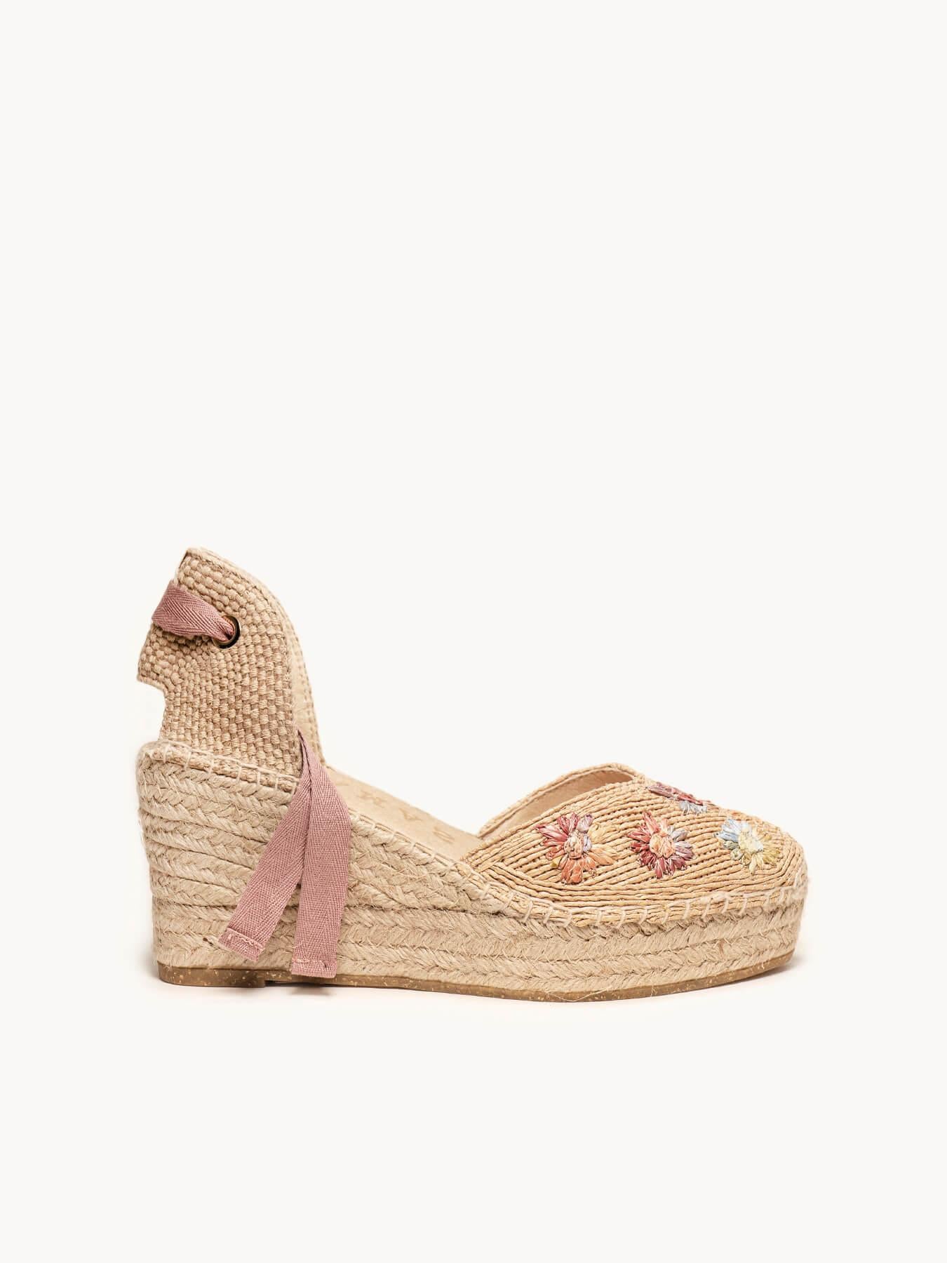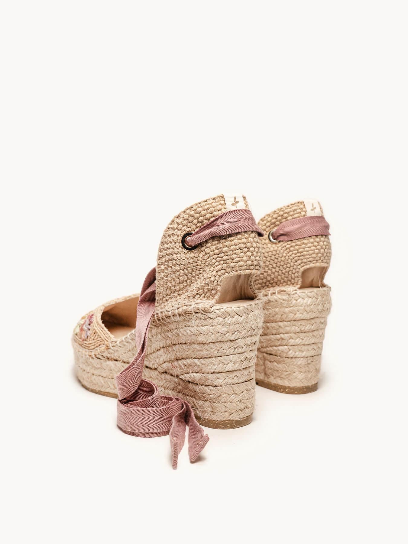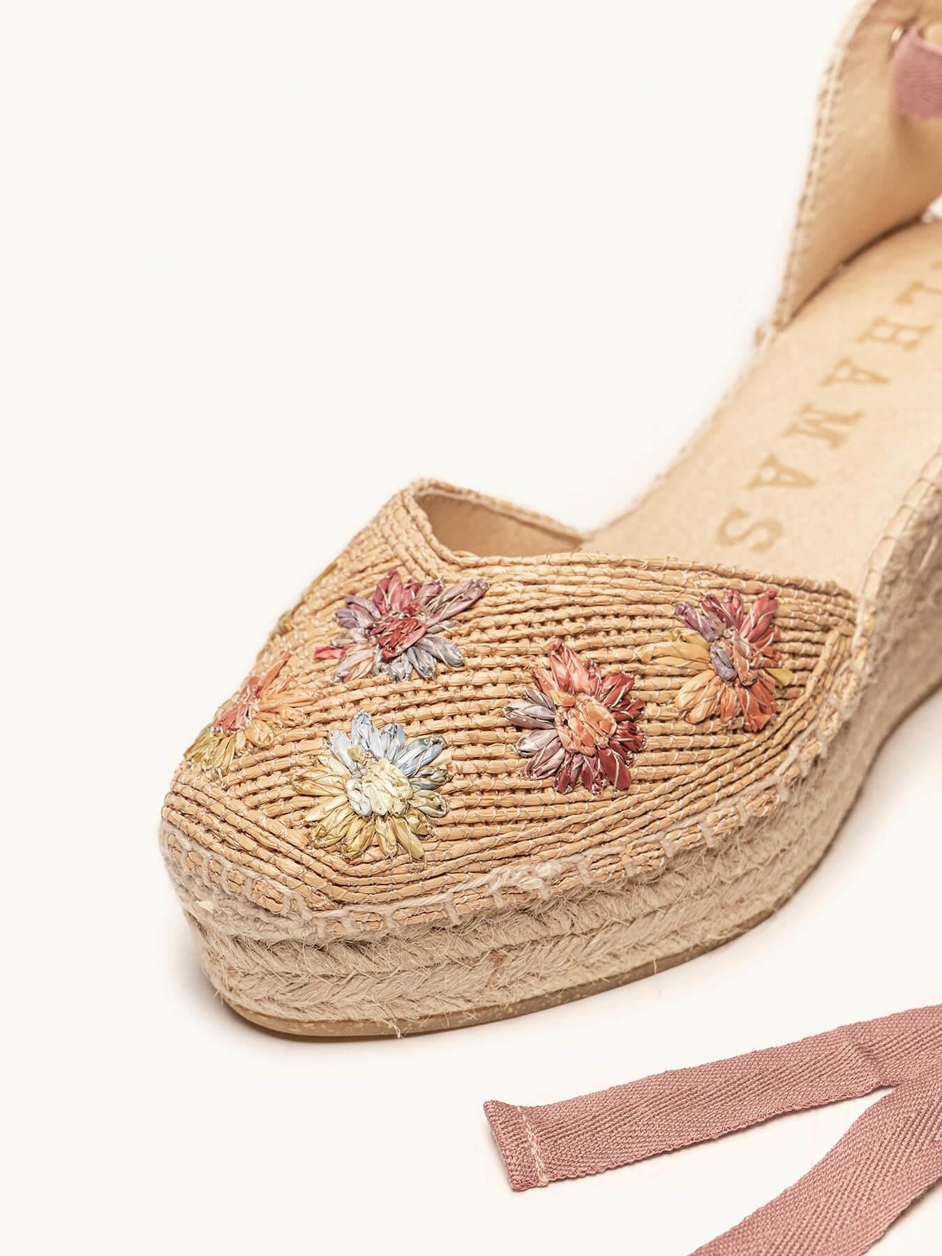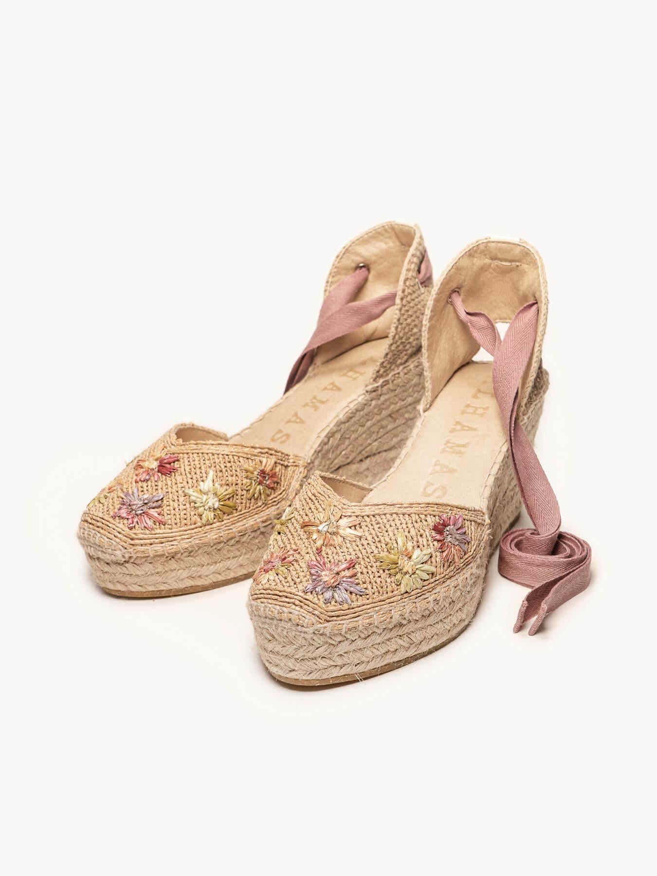 Romero Cuña Media Plataforma Rafia Flores Rosa Claro
