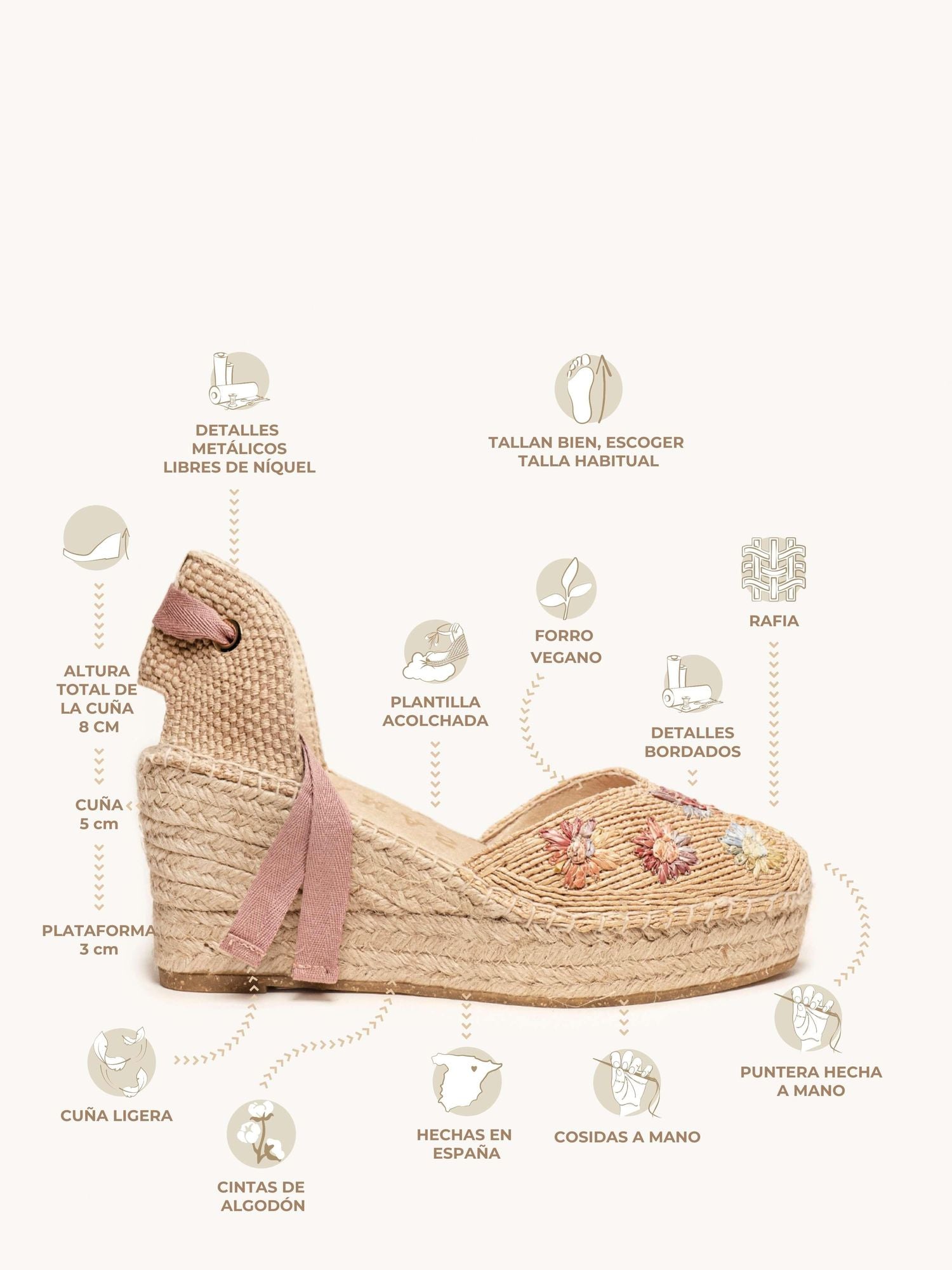- Cuña de trenza de Yute natural con suela de goma reciclada mezclada con fibras naturales.