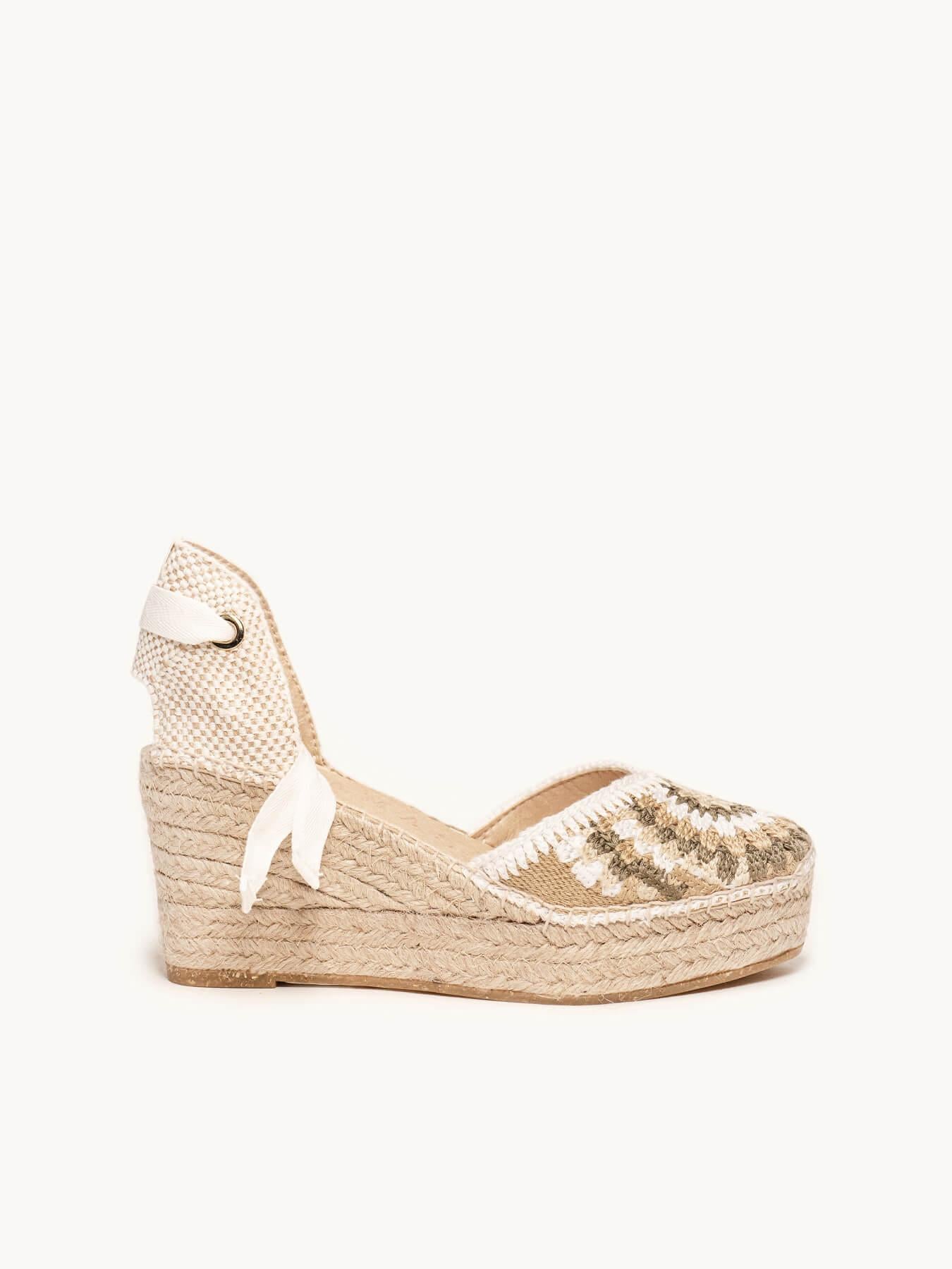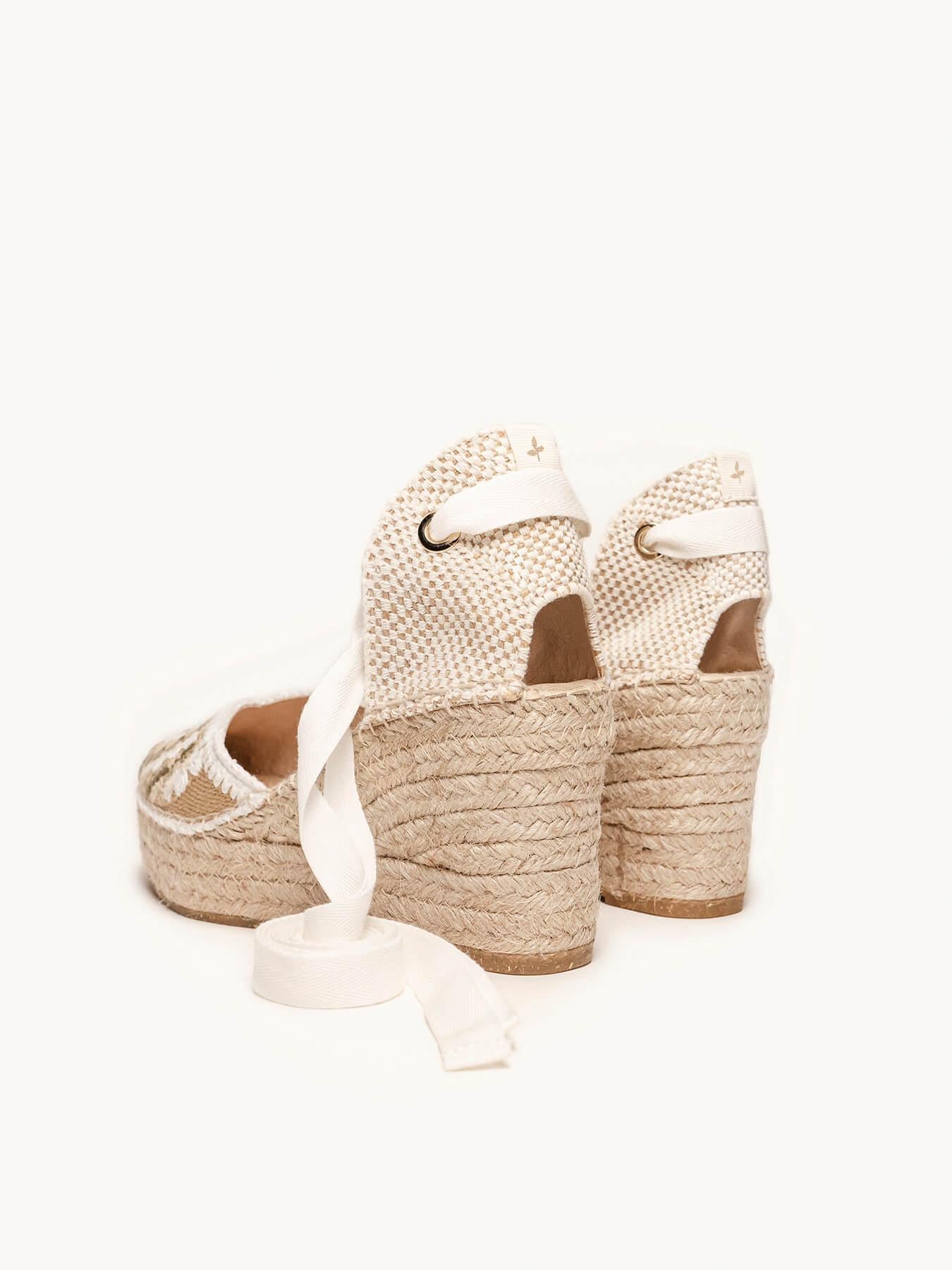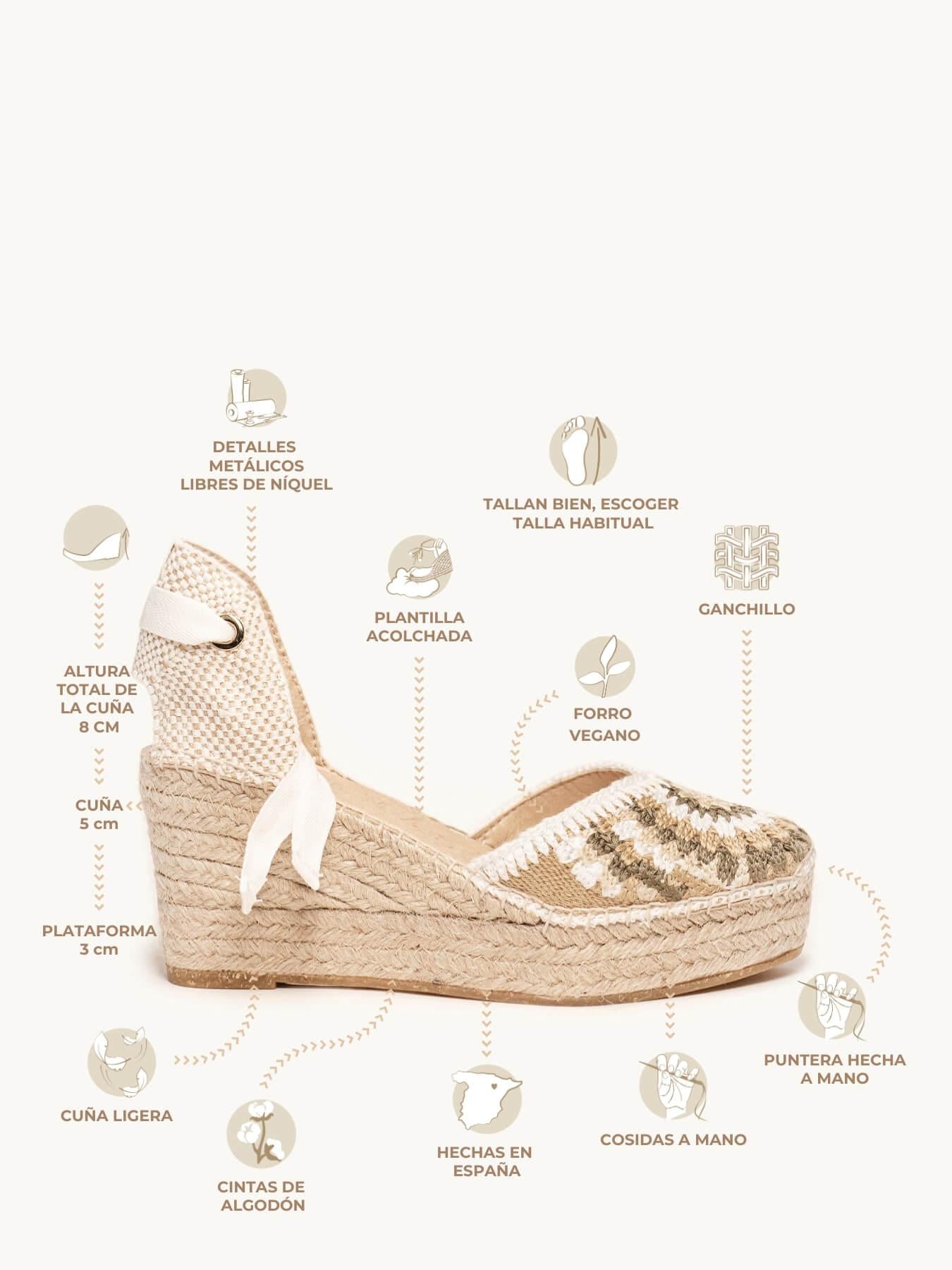 - Cuña de trenza de Yute natural con suela de goma reciclada mezclada con fibras naturales.